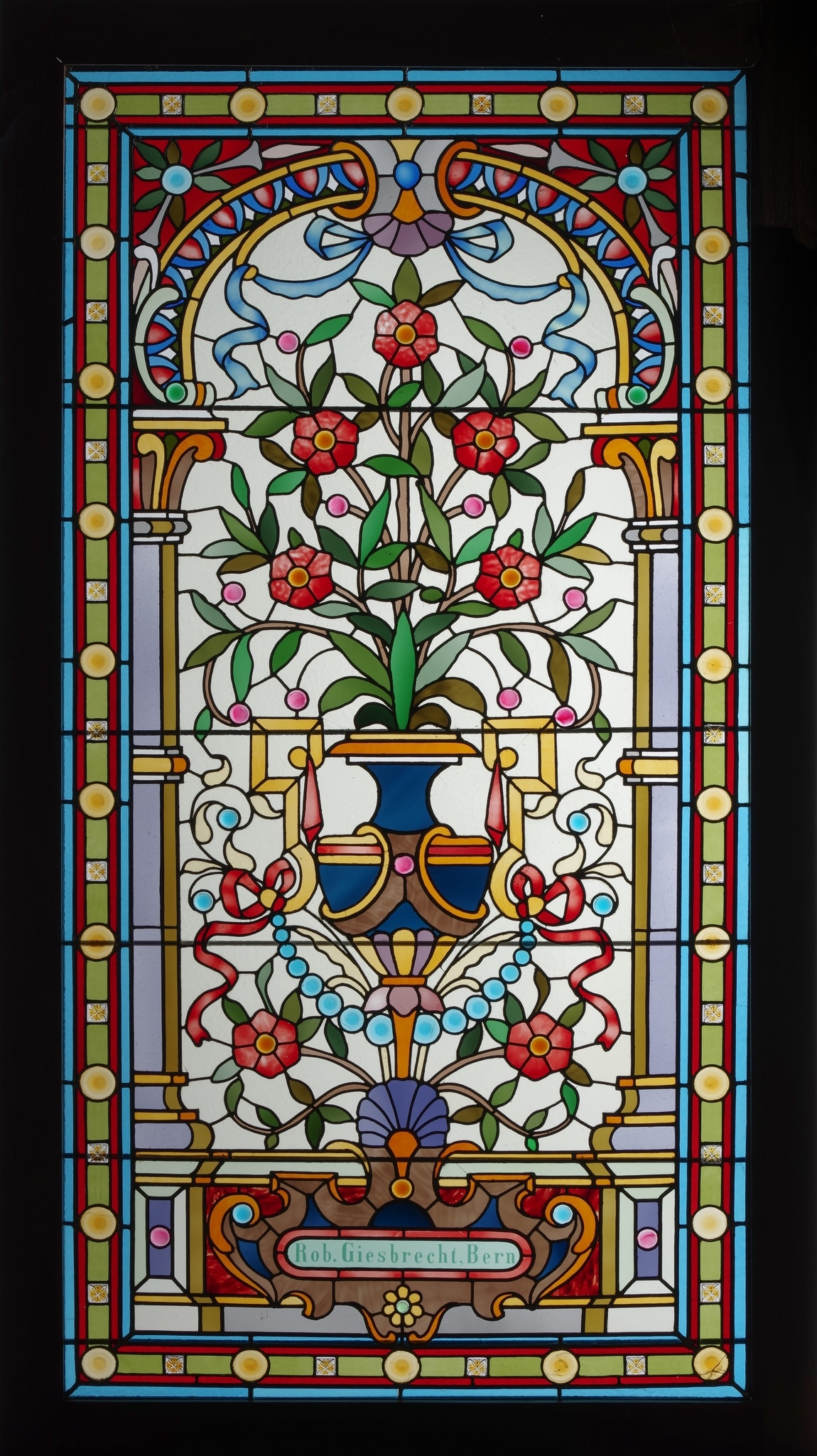 Réalisé dans les mêmes années que l’oeuvre du verrier genevois Louis Hirsch (GE_2359) présentant des pivoines et faisant également partie des oeuvres de la collection du Musée Ariana, les deux bouquets, très colorés, ont été composés sur un fond de verre incolore, témoignant qu’ils ont été créés pour être placés dans un lieu demandant un bon éclairage naturel. Comme Hirsch, Giesbrecht n’utilise ni peinture à la grisaille, ni jaune d’argent, privilégiant une diversité de verres colorés de différents types (verre structuré, verre opalescent, cives, cabochons, verres gravés à l’acide). Les verres opalescents, centraux dans l’oeuvre de Hirsch, ont ici une présence un peu plus discrète, Giesbrecht recourant aussi à de simples verres colorés et à de nombreux cabochons et cives. Il fait aussi un travail important de gravure à l’acide pour apporter des nuances de teintes et de luminosité sur certains détails comme les rubans rouges et bleus.
