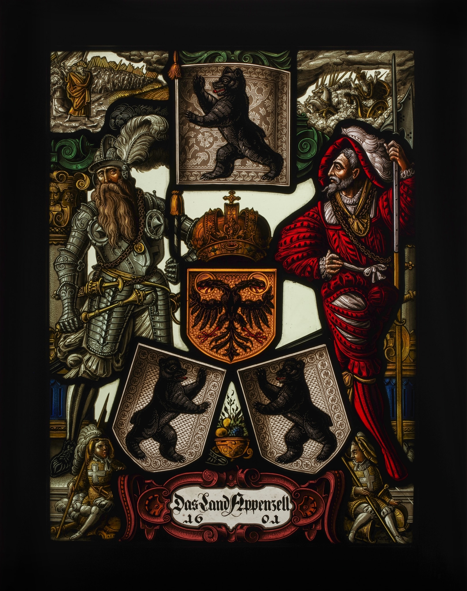 Ce vitrail se divise en trois registres : dans la partie centrale, de part et d’autre d’un plat de fruits, sont représentées sur un fond incolore les armoiries d’Appenzell au-dessus desquelles apparaît l'écu impérial couronné. A gauche en pied, se tient le porteur de la bannière d’Appenzell et à droite un homme tenant une lance de sa main gauche. Le banneret, coiffé d’un casque à plumes, est revêtu d’une demi-armure à la ceinture de laquelle est attaché un poignard suisse (baselarde) rangé dans son fourreau. Il tient dans sa main droite une masse d’armes hérissée de pointes métalliques. L’homme à droite est vêtu d’une chemise rouge à manches bouffantes et d’un bas à fentes ouvertes et de collants rayés rouge et noir. L’encadrement architectural sous lequel figurent les deux hommes est constitué de deux larges colonnes couronnées de chapiteaux à volutes et grotesques. En haut, dans l’écoinçon de gauche, Moïse lève ses deux bras en direction de la mer, alors que les enfants d’Israël à l’arrière-plan sont sains et saufs sur la berge, et fait réapparaître les eaux dans le lit de la Mer rouge qui engloutit les chars égyptiens et les cavaliers figurés sur l’écoinçon de droite. En bas, de part et d’autre du cartouche encadré de volutes, se présentent deux enfants assis, habillés en guerrier et tenant chacun une hallebarde et une lance.