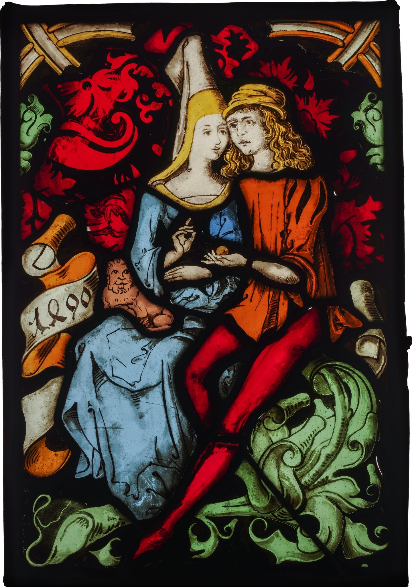 Ce vitrail présentant un couple d’amoureux inscrit sur un fond ornemental damassé, semble être un fragment d’une scène plus grande, l’arrière-plan paraissant incomplet. Réalisé par le peintre verrier munichois Carl Bouché en 1890, ce panneau est peut-être une copie d’un vitrail ancien qui, lui, était intégré à une verrière plus vaste. Probablement que seul le sujet du couple d’amoureux devait intéresser le verrier.