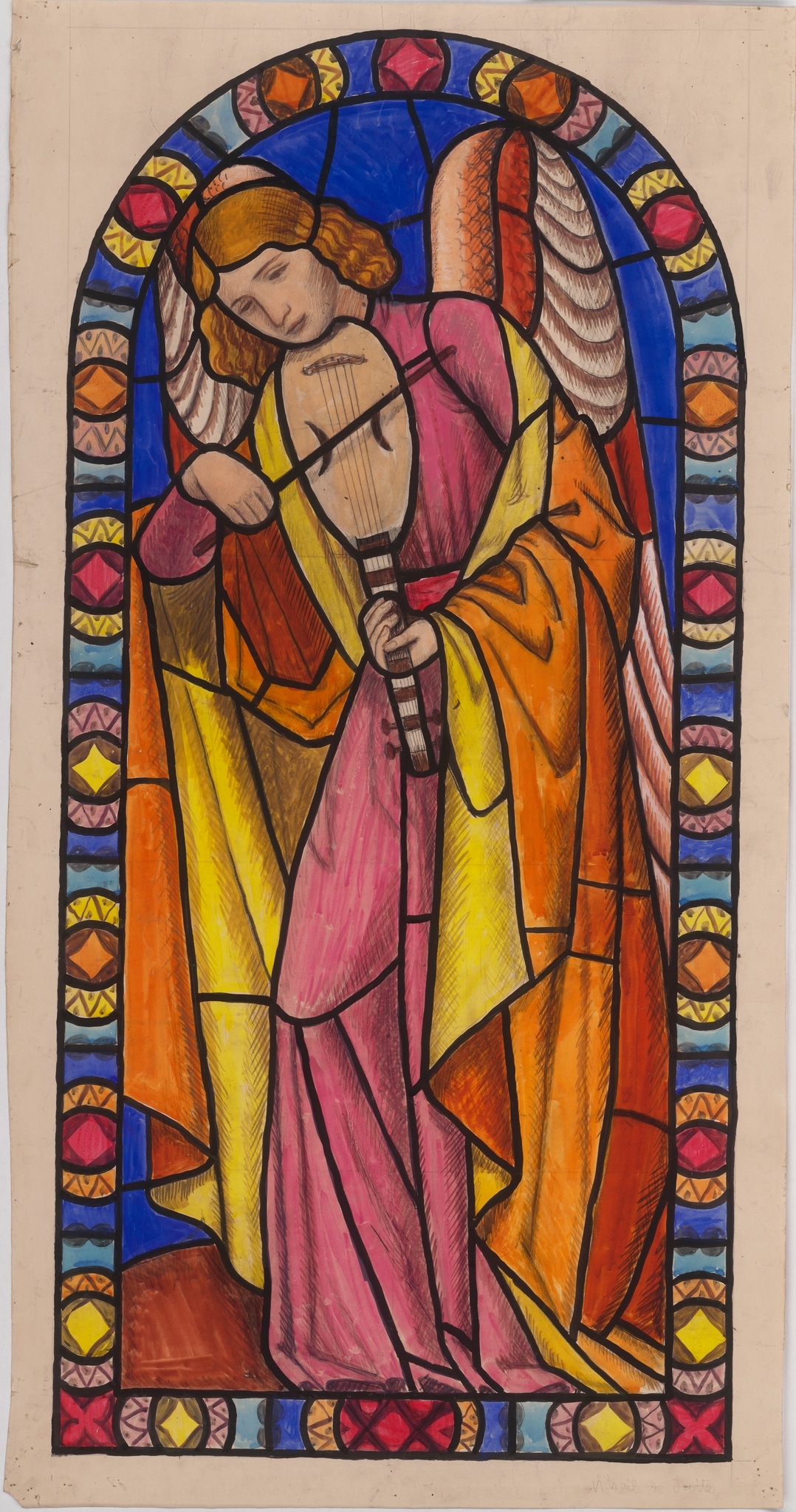 Ce carton pour un vitrail en plein cintre illustre un des deux anges musiciens accompagnant sainte Cécile, figurée sur la verrière centrale. Présenté debout tourné vers gauche et vêtu de rose sous une cape orange et jaune, il est en train de jouer du rebec (violon médiéval), son menton appuyé sur son instrument. De grandes ailes multicolores s’étendent derrière son dos.