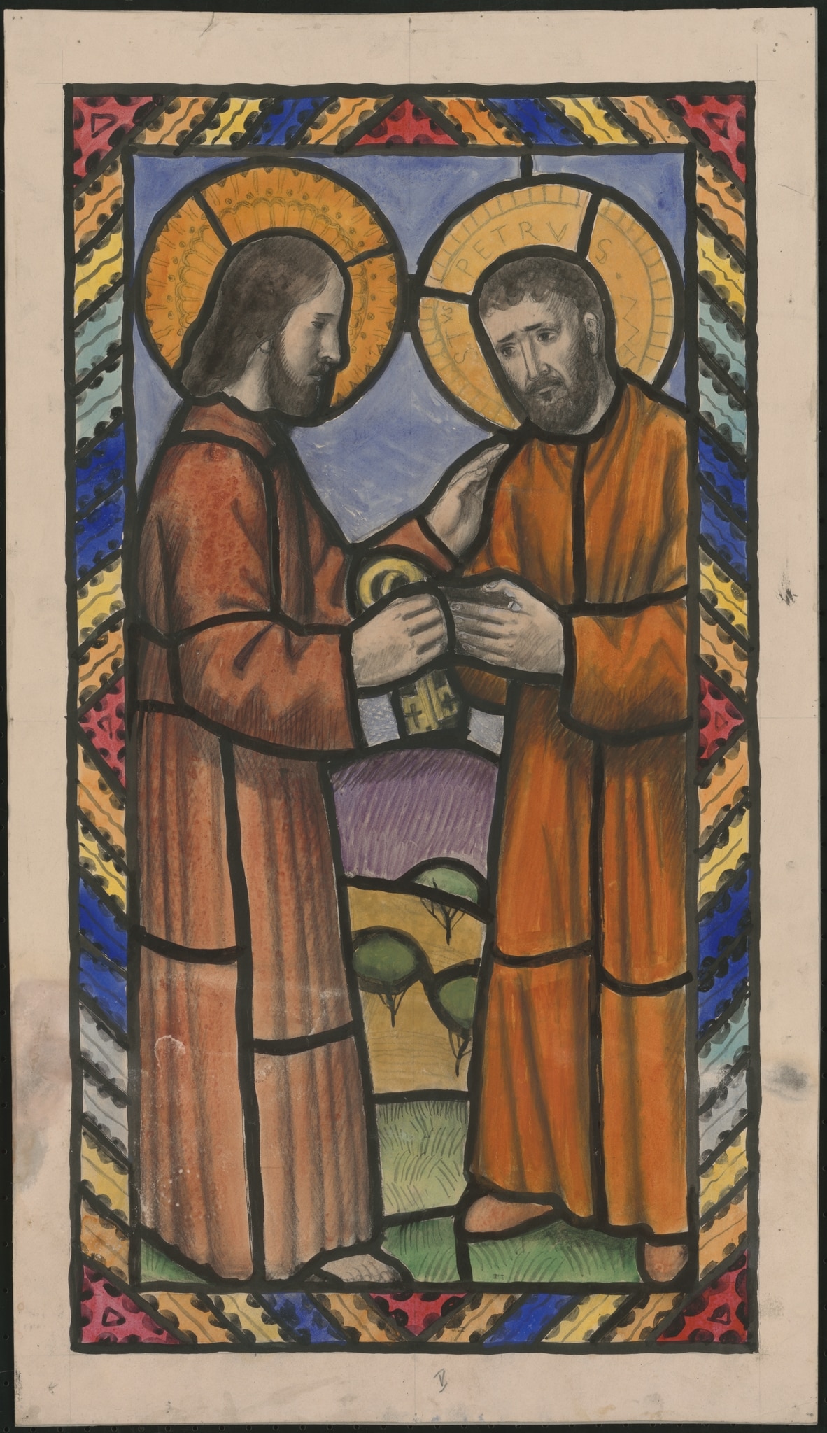 Ce carton illustre la remise des clefs du Royaume des cieux par le Christ à saint Pierre. A gauche, le Christ de profil et nimbé, vêtu d’une longue robe rouge, pose sa main gauche sur l’épaule de saint Pierre qui lui fait face et lui remet les clefs. Celui-ci, également auréolé, est habillé d’orange et tend la main vers celle du Christ. A l’arrière-plan, entre les deux protagonistes s’étend un paysage arboré.