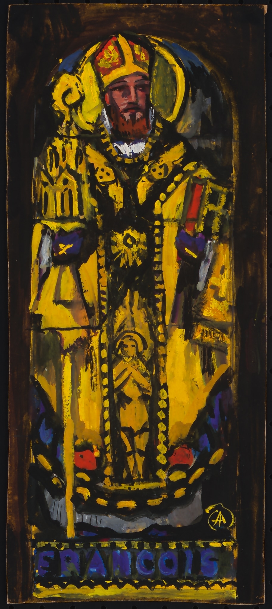 Cette maquette est un projet à échelle réduite pour la baie centrale de la fenêtre tripartite consacrée à saint François de Sales, située sur la façade nord-ouest de la nef de l’église Saints-Pierre-et-Paul d’Orsonnens, construction emblématique de l’architecte du Groupe de Saint-Luc Fernand Dumas, en 1935-1936 (Lauper, 2012, p. 209). L’artiste Alexandre Cingria conçoit l’ensemble des neuf vitraux de la nef en 1939, en collaboration avec le Fribourgeois Willy Jordan (Jordan, 1958, p. 6), auteur de la polychromie générale du sanctuaire, des mosaïques du choeur et de la chaire, des ornements et vêtements liturgiques ainsi que des vitraux du choeur, de la sacristie et du baptistère (Jordan, 1958, p. 2, 5). L’atelier fribourgeois Kirsch et Fleckner réalise l’ensemble des vitraux de la nef.