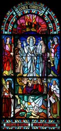 La comparaison de cette maquette avec le vitrail nous révèle quelques changements mineurs, certainement décidés avec l’abbé Borcard qui avait élaboré le programme iconographique. Les anges musiciens qui encadrent la scène ne sont plus accompagnés d’instruments de musique sur le vitrail mais portent flambeau et encensoir, alors que l’inscription sur la bordure du bas a changé et est devenue plus courte.