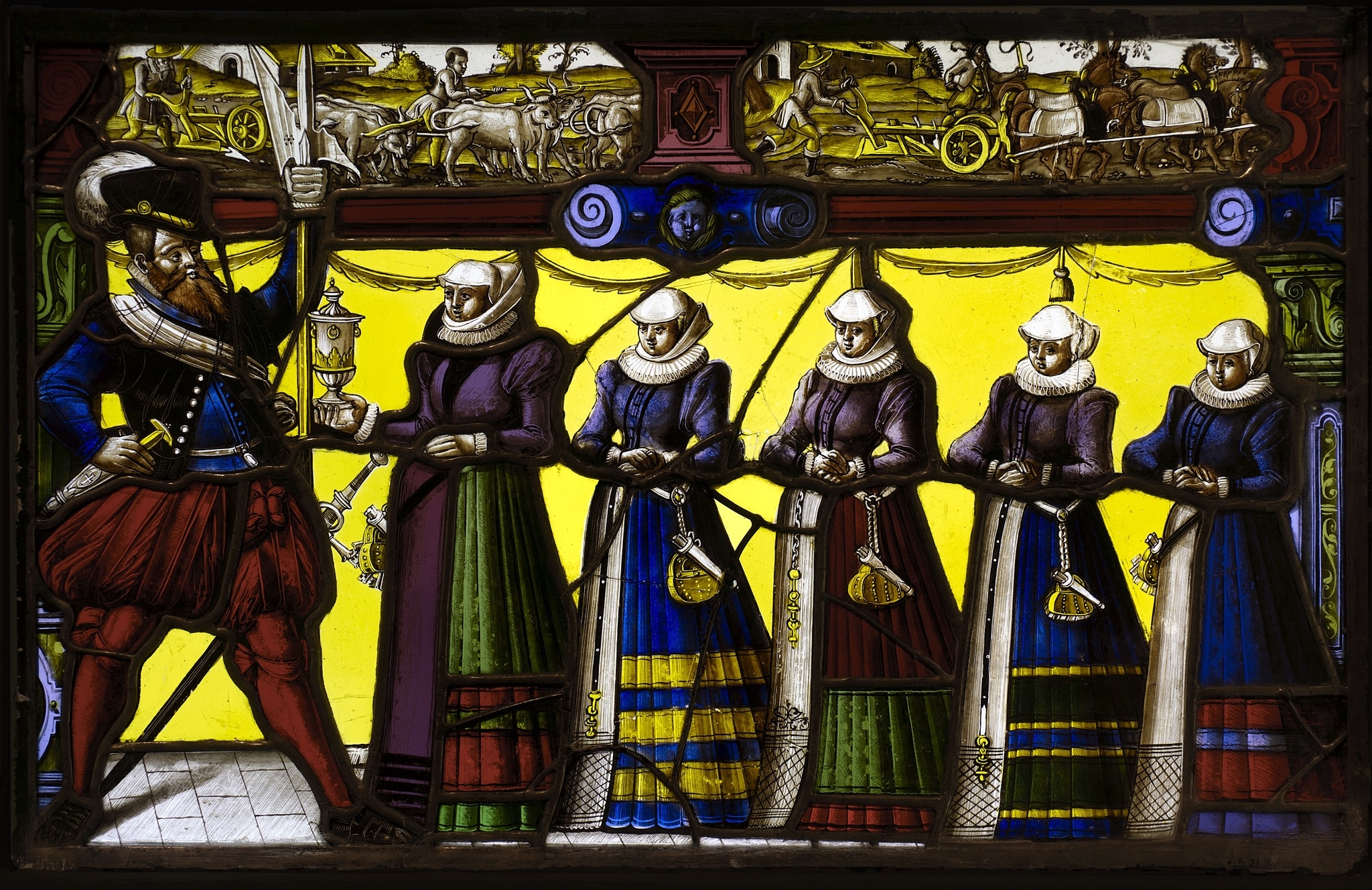 On the left, the wealthy farmer is dressed in a black hat with a white plume, a blue jacket with a black waistcoat and white sash, red breeches and hose, and black shoes. He holds a pike in his left hand and rests his right hand on his “dolch,” the knife at his waist. Facing him, his wife presents a silver cup trimmed in gold. Behind her are their four daughters. The stance and dress of the women are almost identical, but vary in color. They wear white coifs and ruffs at neck and wrist, over dresses with tight-fitting bodices and puffy sleeves at the shoulders. Their headdresses mark them as married women. The long skirts are split in the front to display petticoats. Those of the daughters are white, while the wife’s is a deep purple that corresponds to her bodice. The wife and her oldest daughter both wear wimples. From each of the daughter's belts hangs a pouch and a scabbard, probably containing eating utensils such as a small knife and fork. In addition to these items, keys hang from the wife’s belt, indicating her responsibility for the household. Supported by the simple architectural frame, activities of a prosperous farm appear above. On the left is a scene of plowing with a team of oxen, on the right, one with horses. The wealth of the farmer is demonstrated by his having teams of six animals to draw each plow. The function of such panels would seem to be commemorating siblings and honoring parents, since the children are shown without their spouses.