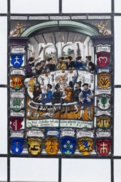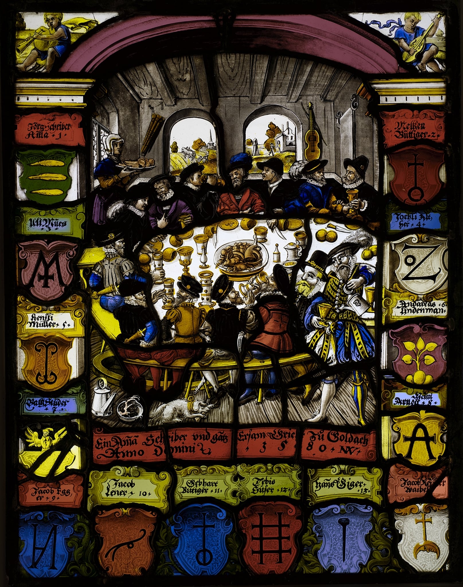 The panel presents a view of a dining room of an inn. A group of men sit at a round table. They are distinguished by their luxurious dress and hats and by the elegant beer pokals and goblets which fill the table. The wooden beams of the floor and ceiling are rendered in a linear manner akin to a woodcut impression, and the miniature-like background landscape viewed through open arches has an expressive, spontaneous quality. A female servant brings in food from the top left. In the foreground, a dog gnaws a bone on the left, and the ceremonial host dressed in blue and white serves wine from a pitcher on the right. At the bottom and sides are coats of arms and inscription identifying the individuals. The colors for the arms and inscriptions that include light blue, pink, yellow, reddish-purple, light green, and orange are familiar from other works by the artist. The concentration of deeper pot-metal color on the shields and inscriptions acts as a frame around the main scene; compositional balance is achieved by red used for the dedicatory inscription at the bottom and for the two magistrates’ names at the top.