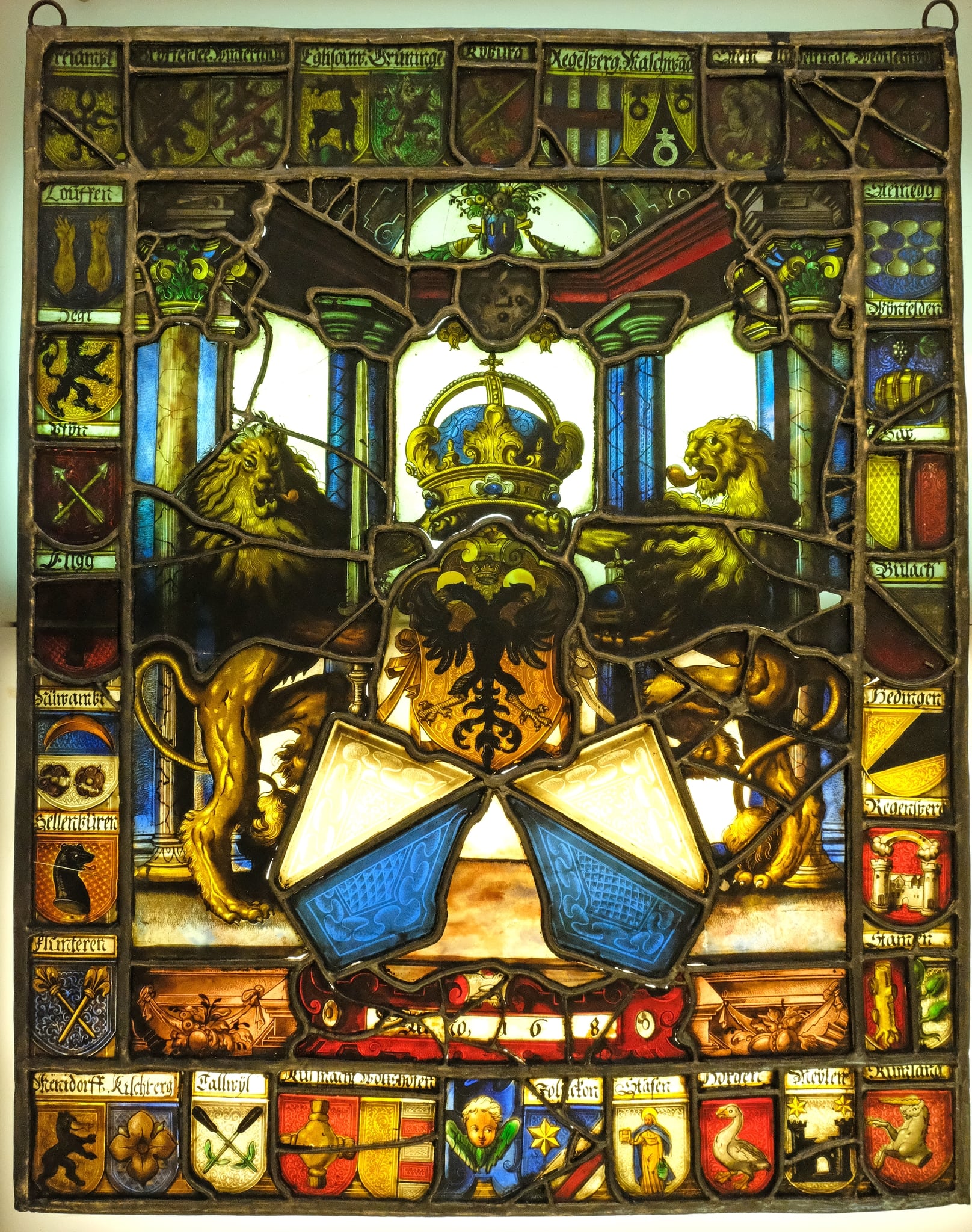 The panel is substantially intact with good shown a few replacements (the ground between the two shields in the Zurich pyramid and the top of the column on the left as well as the lion’s paw touching the crown on the left). It is possible that the shields of Pfyn, Hegi, and Laufen on the upper left have been replaced too.