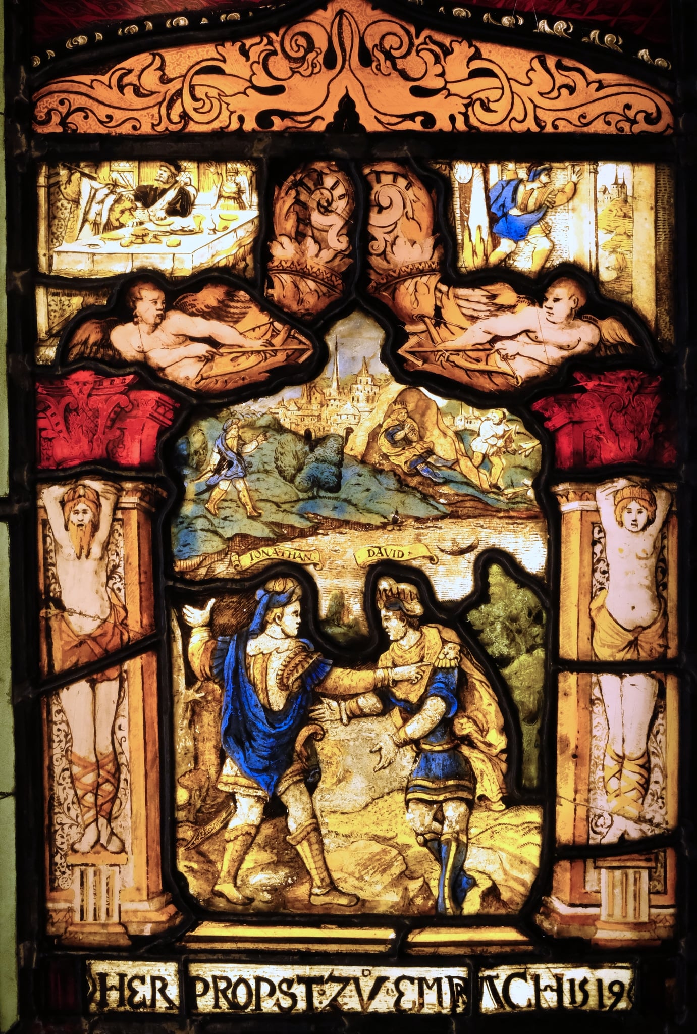 David is often represented with subjects such as of his fight with Goliath, lust for Bathsheba, or simply his representation with the harp, referencing his reputed authorship of the Psalms. The impetus for the representation of David and Jonathan apparently comes from the desire to show a special bond between two men. In a panel of 1659 showing David and Jonathan with the Arms of Albrecht Meyer (Harvard University, Fine Arts Museums 1930.480; Caviness, 1985, p. 56), the inscription reads, “Saul’s son, the holy Jonathan entered into a bond with David. He loved David with all his heart as if he were his true brother. 1 Book of Kings 20). The dedication explains that the panel commemorates Albrecht Meyer of Lenzburg, Johanna Hussler, his wife, and Rudolf Meyer, Albrech’s deceased brother. Similarly, David and Jonathan with the Arms of Johannes Cramer, 1672 (Historisches Museum Thurgau; TG_283) was a pendant to another panel given by a male donor. The inscription reads: “Saul’s son, the holy Jonathan entered into a bond with David. Each loved the other without jest, as if they possessed each other’s heart.” Sadly, with the loss of the Walter’s dedication panel, however, the donors are unidentifiable.