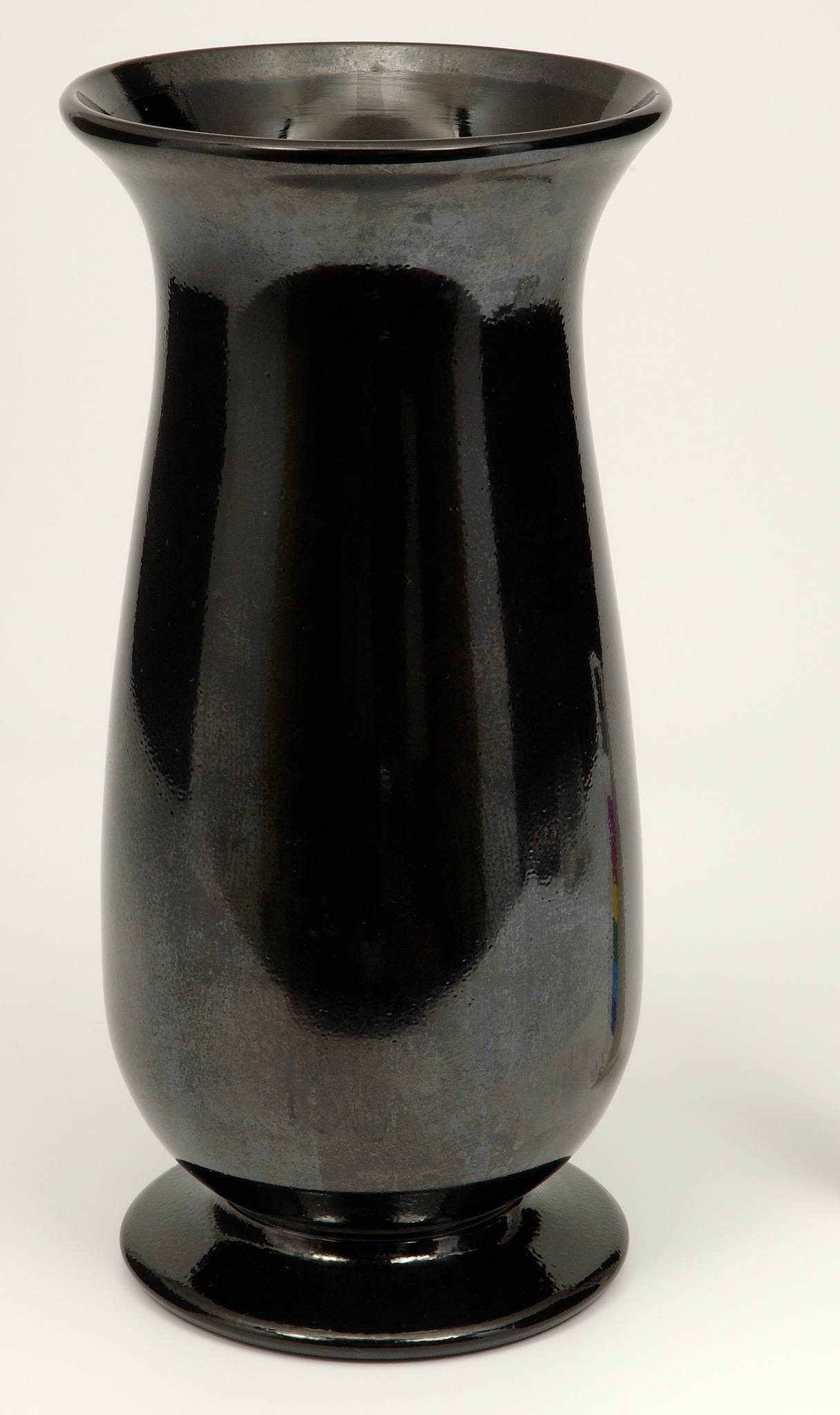 Bien que le vase présenté ici ne soit pas muni du timbre doré des premières années, il a probablement été produit avant 1935. En effet, avec un col légèrement plus large, sa forme diffère des vases produits après 1935. Par ailleurs, issue d’une collection privée, elle témoigne vraisemblablement de la première phase de production de la Verrerie artistique. Le revêtement émaillé noir faisait en outre déjà partie du catalogue en usage de 1931 à 1935. Il évoque les fameuses terres lustrées noires du céramiste Paul Ami Bonifas.