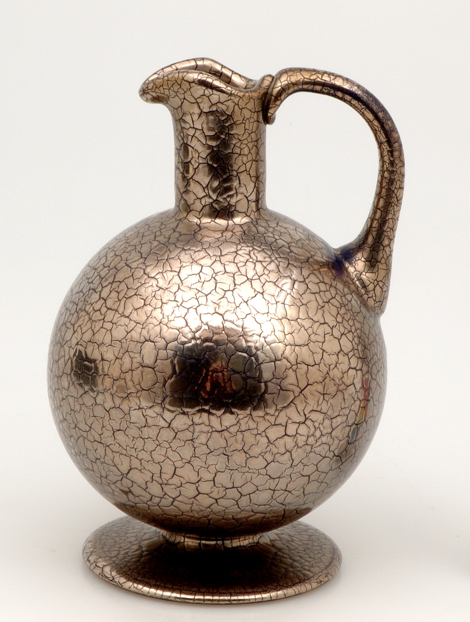 Le revêtement argenté craquelé de la cruche proposée ici est en usage dès 1931. Selon la liste de prix de 1951, ce dernier est alors remplacé par un nouveau revêtement dénommé «platine» (Walther, 2025, 65). Notre cruche a donc été réalisé entre 1935 et 1951.