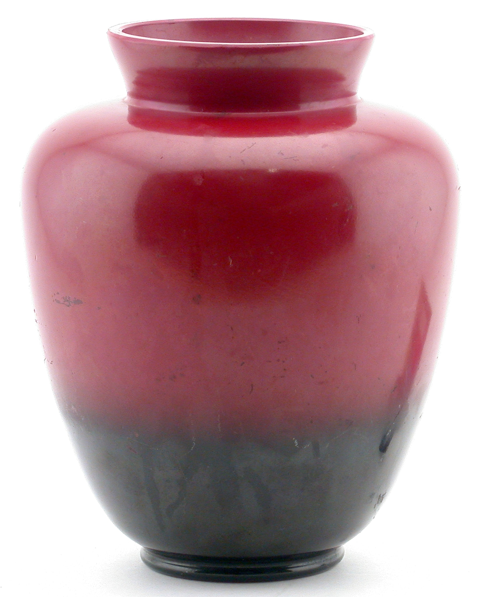 Le vase proposé ici a été soufflé en verre brun. Cette coloration est intéressante. Elle est en usage à la Verrerie artistique à deux reprises: de 1931 à 1935, souvent accompagnée du timbre doré appliqué sur le fond du vase. Elle est à nouveau documentée à partir de la publication des trois modèles du catalogue de 1949 (Walther, 2025, 64-65).