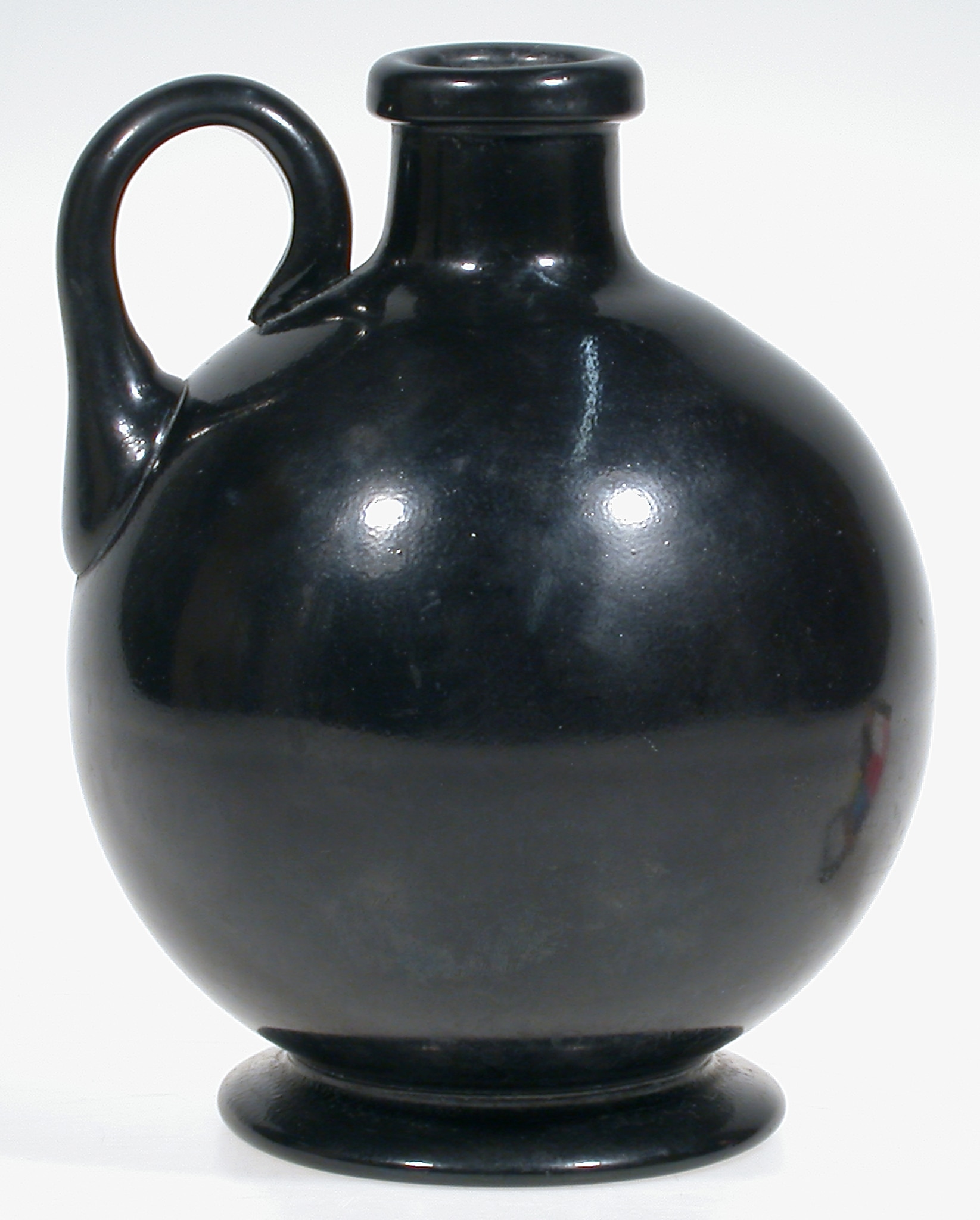 Cruche sphérique noire à anse et pied appliqué, col droit et lèvre retournée