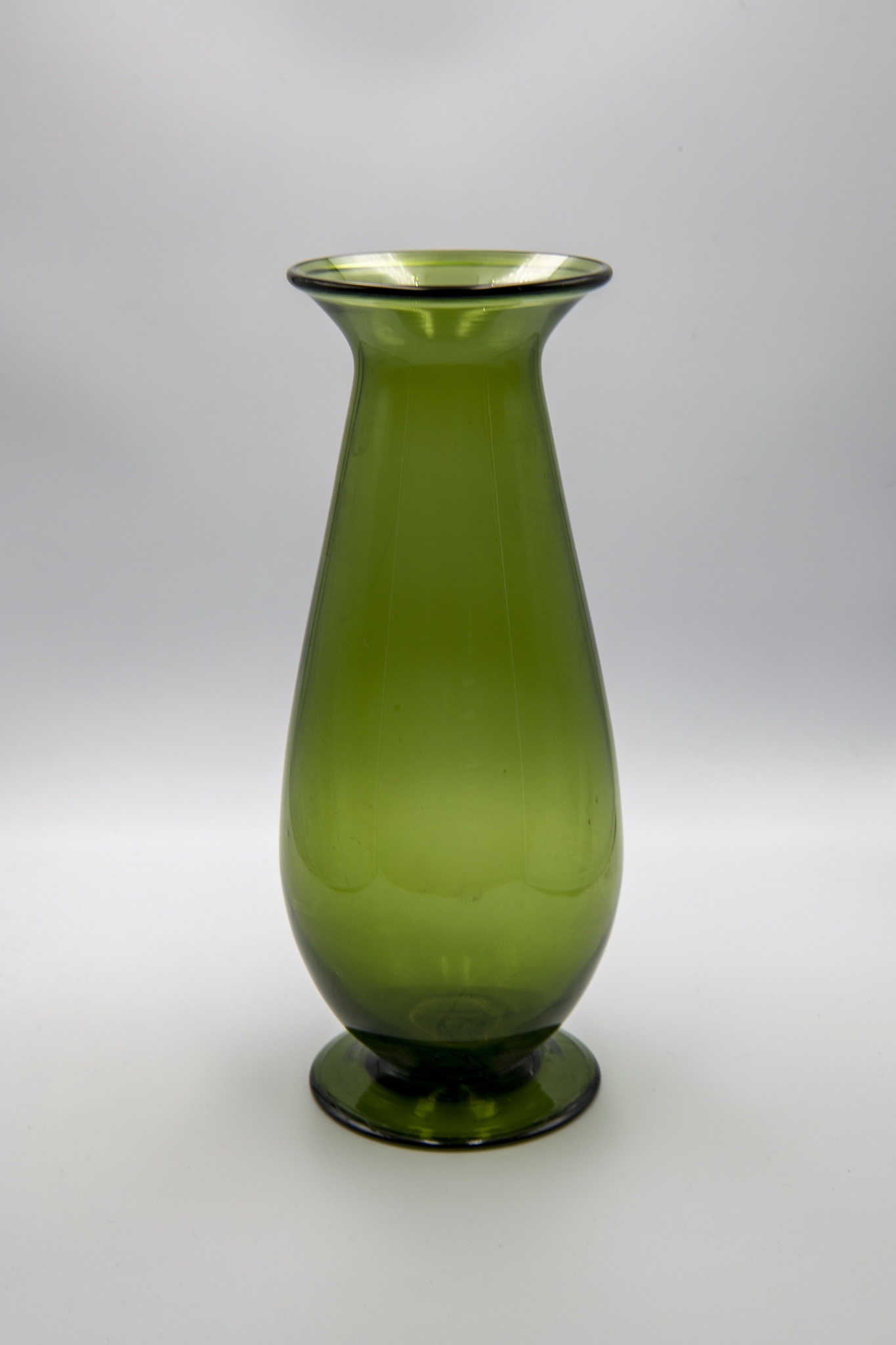 Sans le timbre doré des premières années ou d’autres particularités, rien ne suggère que le vase présenté ici ait été produit avant 1935. Lorsque les pièces en verre vert ne présentaient ni impuretés ni défauts de fabrication, elles étaient commercialisées telles quelles. Sinon, elles servaient de base à la réalisation de vases émaillés.
