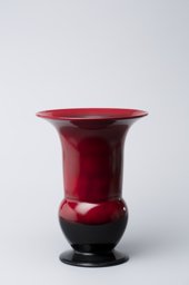 Ce modèle (180) de vase de la Verrerie artistique (1930-1964) a été commercialisé dès 1937. Les sources dont nous disposons sont des catalogues de la Verrerie de St-Prex, certains inédits. Il fait partie de l’offre des "Nouveautés", publiée en 1937 (Verreries de St-Prex, 1937, H 28 cm), qui est disponible en verre vert (VV), émaillé en noir, rouge-brillant et rouge-mat (N, RB et RM), en bleu-brillant et bleu-mat (BB et BM), en argenté lustré et craquelé (AL et AC), et finalement en or bordé, lustré ou craquelé (OB, OL et OC). Il figure finalement dans un répertoire non publié, qui, basé sur les numéros d’inventaire des catalogues de 1935 à 1960, dresse la liste de tous les modèles de la production artistique (Verreries de St-Prex, 1964, H 28 cm). D’après les sources, ce modèle est ainsi mis en vente dès 1937 et produit jusqu’en 1964.
