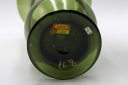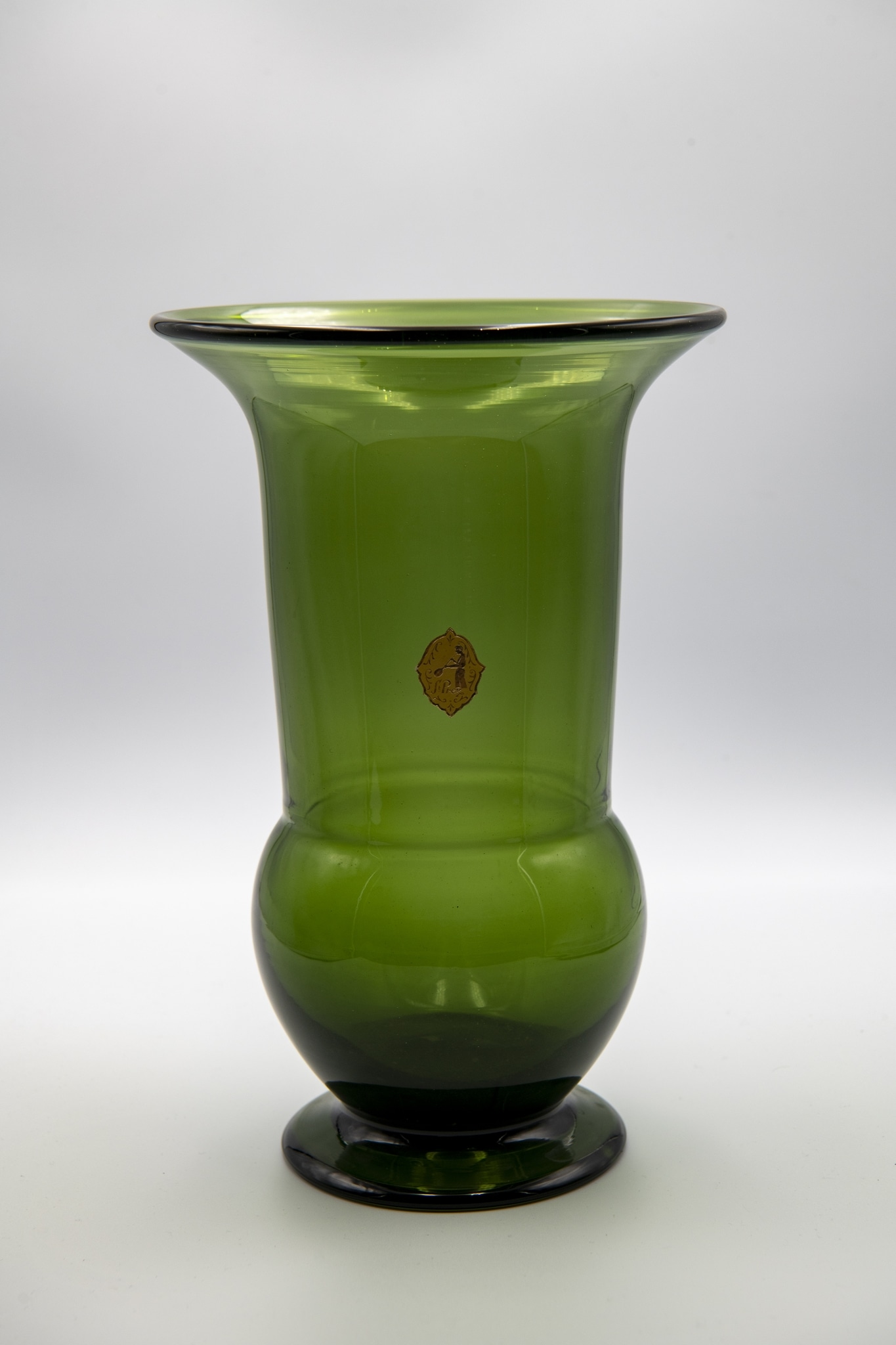 Le vase proposé ici est en verre vert. Lorsque ces pièces ne présentaient ni impuretés ni défauts de fabrication, elles étaient commercialisées telles quelles. Sinon, elles servaient de base à la réalisation de modèles émaillés.