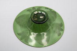 Ce modèle de coupe (134) fut créé à une période précoce de la Verrerie artistique (1930-1964). Les sources dont nous disposons sont des catalogues de la Verrerie de St-Prex, certains inédits, tels que les albums noirs munis de photographies de vases, vraisemblablement utilisés par les représentants de 1931 à 1935, où il est référencié comme coupe en verre vert, soit gravée à l’acide, soit unie. (Verreries de St-Prex, 1931). Ce modèle fait également partie de l’offre du premier catalogue de vente imprimé de 1935 (Verreries de St-Prex, 1935, 7), où il est présenté en verre vert.
