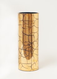 Ce modèle (202) de vase de la Verrerie artistique (1930-1964) a été mis en vente vers 1960. Les sources dont nous disposons sont des catalogues de la Verrerie de St-Prex, certains inédits. Il fait partie de l’offre de la liste de prix de 1960 (Verreries de St-Prex, 1960), disponible en verre vert, émaillé noir, rouge et bleu ainsi qu’en or craquelé et platine. Il figure enfin dans un répertoire non publié, qui, basé sur les numéros d’inventaire des catalogues de 1935 à 1960, dresse la liste de tous les modèles de la production artistique. Notons que les images des modèles de 1960 ne sont pas tirées des catalogues, mais esquissées d’un coup de crayon rapide. Le no 200 est annoté ainsi : "Pile Rittmeyer n’allant pas à la jauge". Il pourrait s’agir d’un verre technique pour la société Rittmeyer, fondée en 1904 et spécialisée dans les systèmes de mesure, ce qui expliquerait le grand nombre de pièces en verre incolore (Verreries de St-Prex, 1964, H 18.5, 25, 32 cm). Un inventaire de fin d’année pour les années 1955 à 1958, conservé dans les archives du Musée du Verrier de Saint-Prex, recense en effet une production de 671 exemplaires pour 1958 (Verreries de St-Prex, 1955, 257-259). Ainsi, il est probable que la Verrerie de St-Prex ait profité de synergies internes pour la création d’un nouveau modèle. D’après les sources, ce dernier fut commercialisé de 1958 à 1964.
