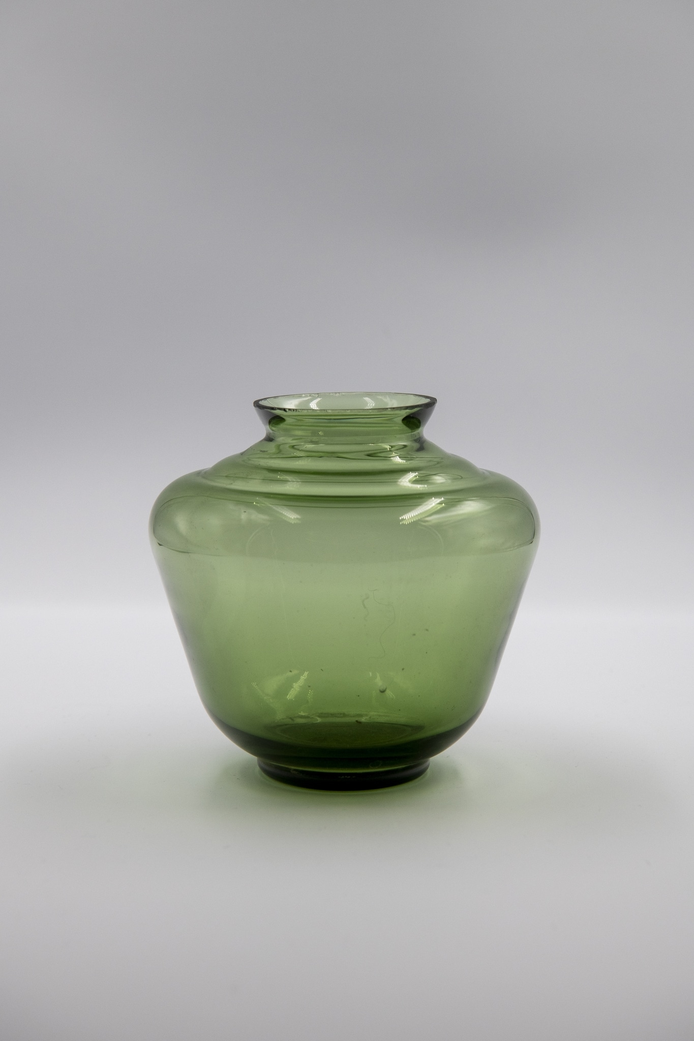 Le vase proposé ici est en verre vert. Lorsque ces pièces ne présentaient ni impuretés ni défauts de fabrication, elles étaient commercialisées telles quelles. Sinon, elles servaient de base à la réalisation de modèles émaillés.