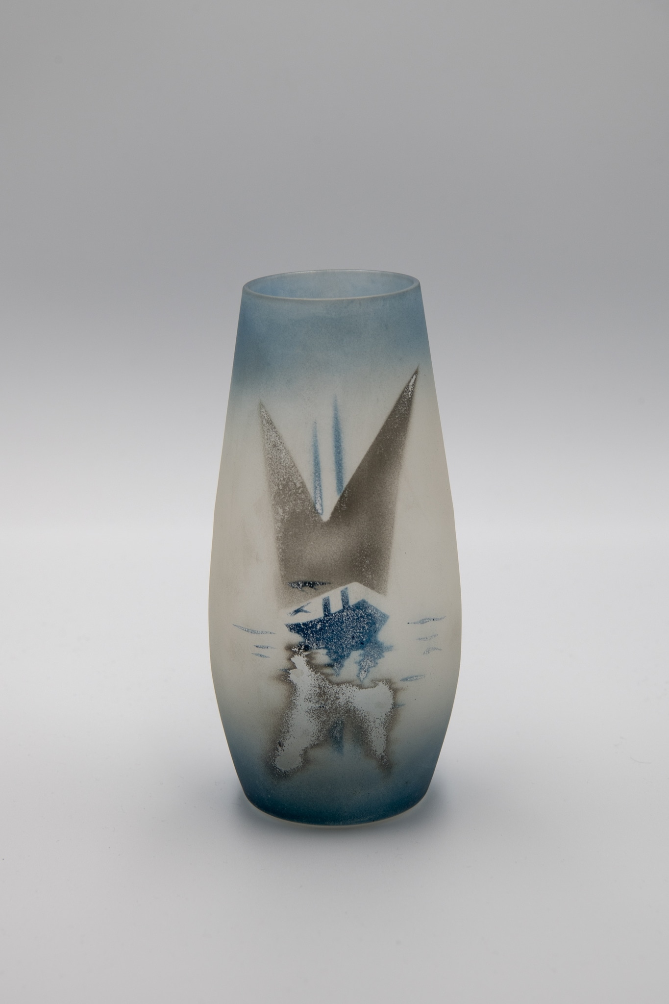 D’après ces sources, ce modèle fut élaboré en vue du Comptoir suisse de 1930. Il est présent dans le corpus avec une surface sablée, ornée de différents motifs posés à l'aérographe et au pochoir. L'un d'eux a été couvert d'oxydes et recuit, donnant une structure marbrée bleue au verre.