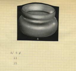 Ce modèle de jatte (8) fut créé à une période précoce de la Verrerie artistique (1930–1964). Les sources dont nous disposons sont des catalogues de la Verrerie de St-Prex, tels que les albums noirs munis de photographies de vases, vraisemblablement utilisés par les représentants de 1931 à 1935. Ce modèle y figure en deux variantes, soit sablé et orné d’un décor floral (Verreries de St-Prex, 1931, "Jattes"), soit en verre ouraline (VA) taillé. Il est également proposé dans le premier catalogue imprimé (Verreries de St-Prex, 1935, 1, no 8). Un répertoire non publié de toute la production artistique de Saint-Prex à partir de 1935 donne une base solide ([Répertoire, 1964, n° 8). Cette jatte y est proposée en 9, 11 et 15 cm de diamètre.