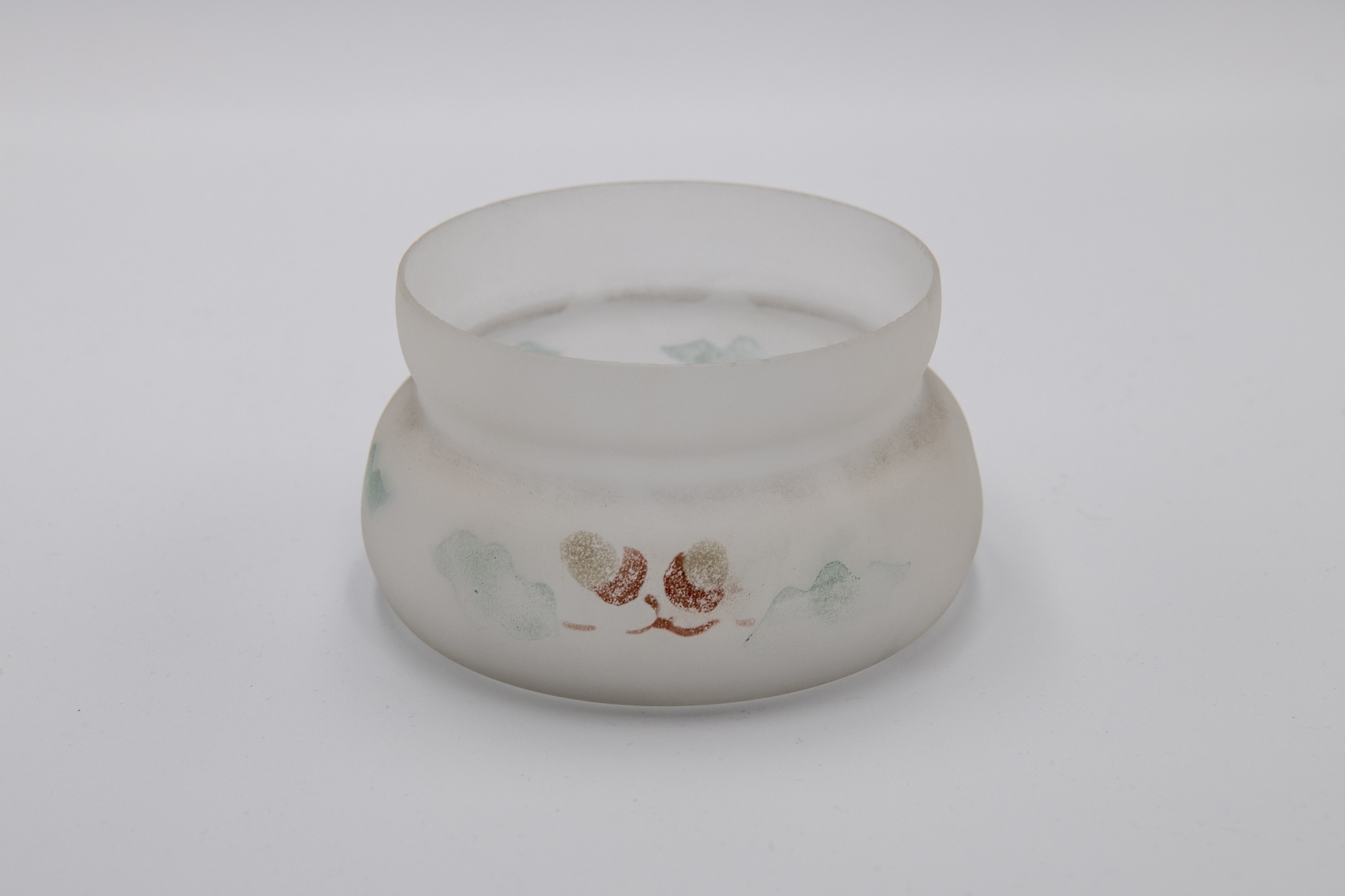 L’objet présenté ici fut réalisé à l’aide de verre incolore sablé. À la fin du catalogue de 1935 (Verreries de St-Prex, 1935, 19, "Articles décorés"), on trouve six objets sablés et peints, réalisés pour la collection présentée au Comptoir suisse de 1930.