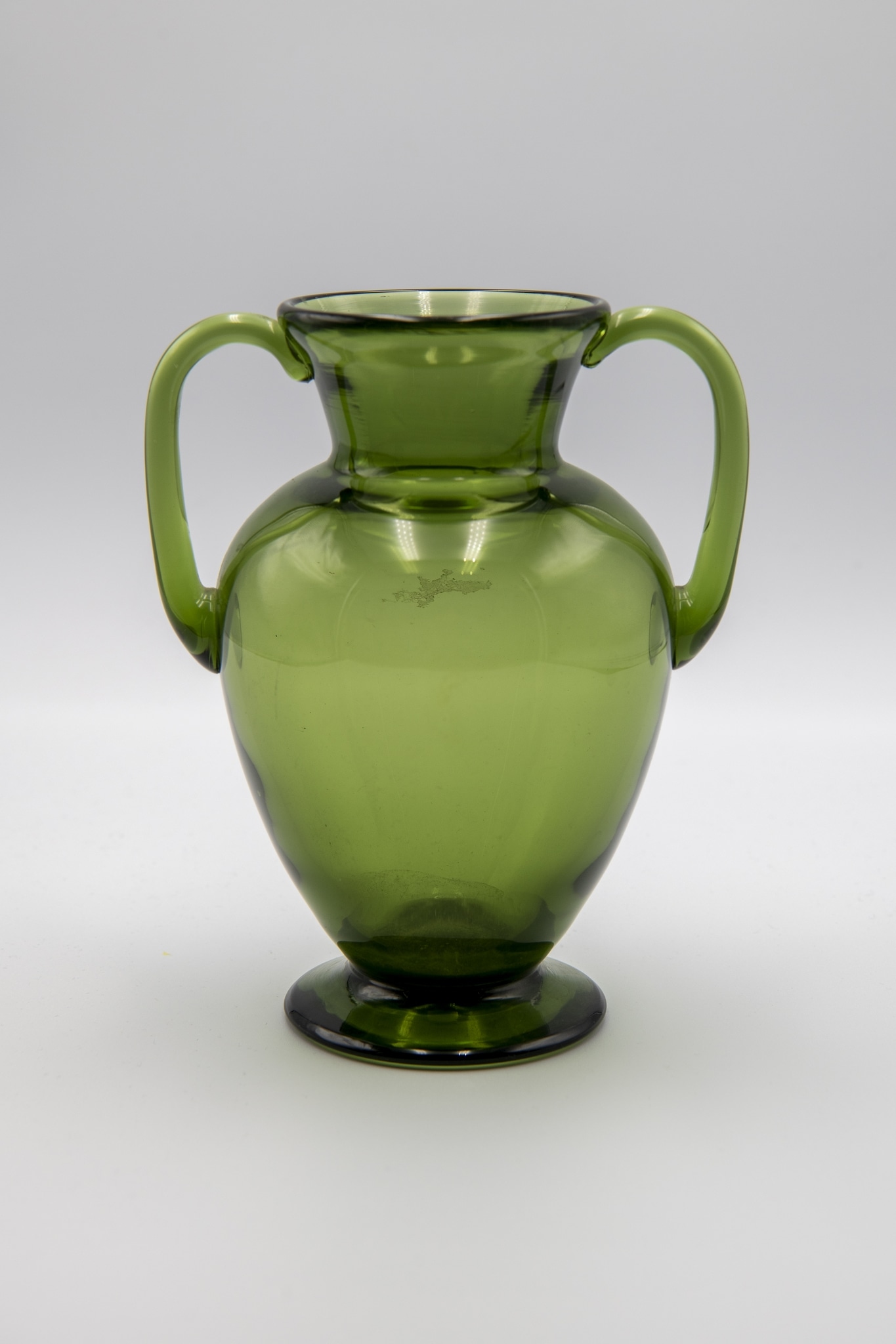Le vase proposé ici a été réalisé entre 1949, date du modèle, et 1964. Lorsque les pièces en verre vert ne présentaient ni impuretés ni défauts de fabrication, elles étaient commercialisées telles quelles. Sinon, elles servaient de base à la réalisation de modèles émaillés.
