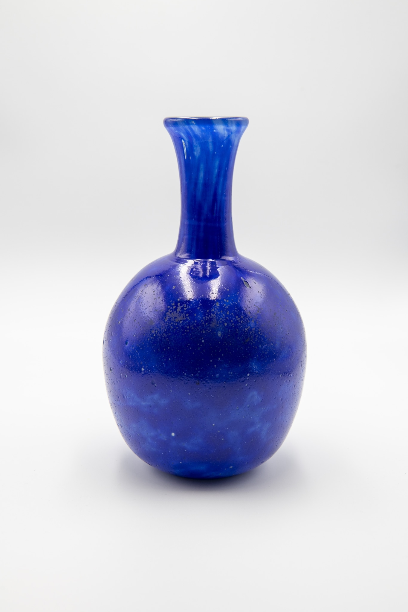 Verre incolore soufflé en moule de bois grossier, inclusions de poudre de verre bleue et blanche, talon, long cou, lèvre évasée, surface irisée; forme: panse ovoïdale