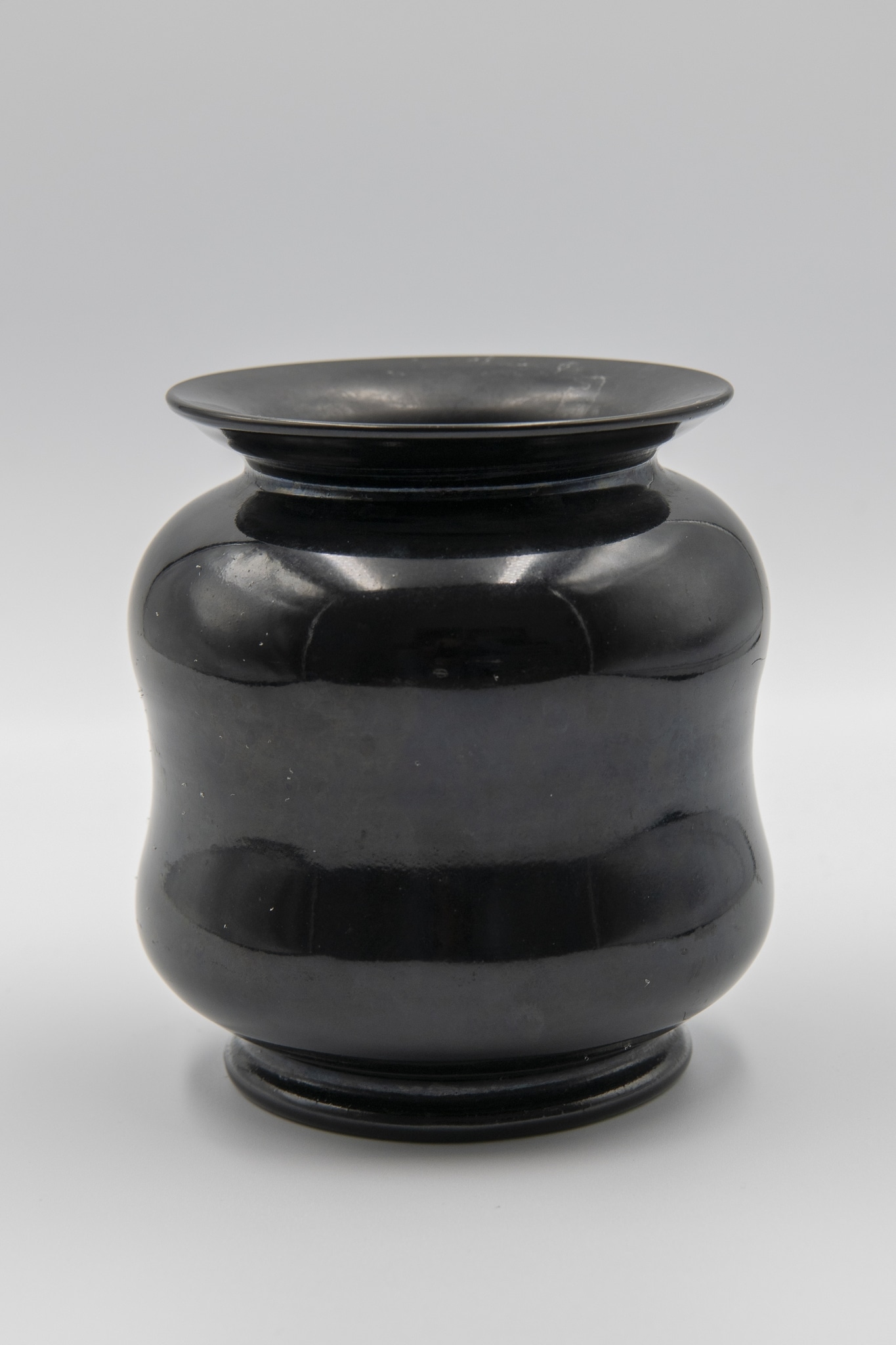 Avec le timbre doré des premières années, le vase présenté ici a assurément été réalisé avant 1935. Soufflé en moule à côte ("rigadin" à Venise), il correspond en effet au modèle no 175 du premier catalogue. En revanche, le revêtement émaillé noir a été utilisé de 1931 à 1964.