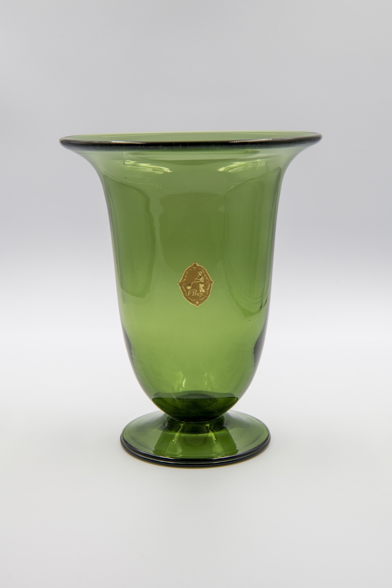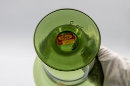 Le vase en verre vert présenté ici, muni de l'étiquette dorée, est typique de la production de 1935 à 1964.