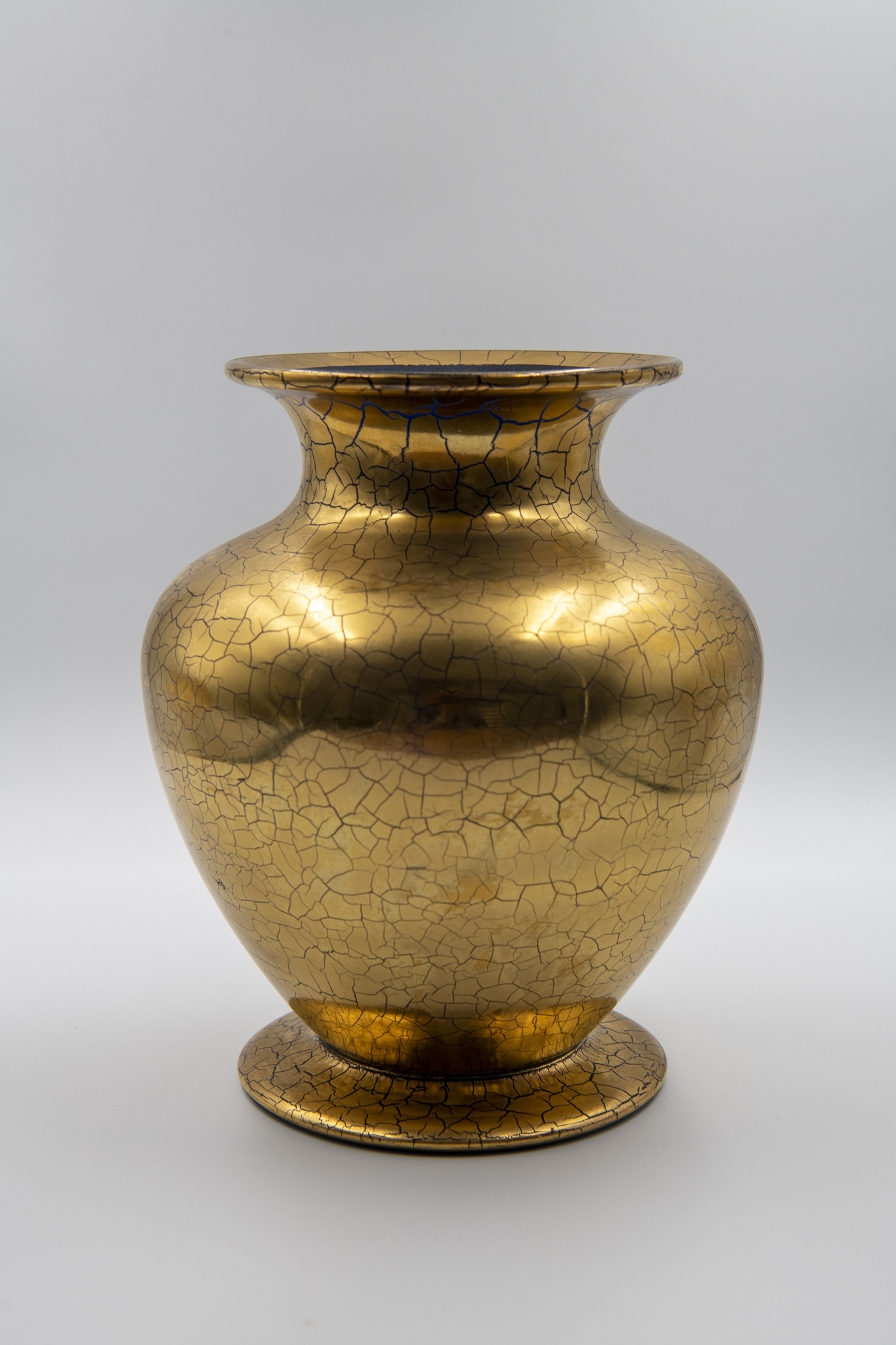 Le vase présenté ici a été réalisé avec du verre turquoise. Cette coloration semble avoir été fréquente pendant ou peu après la Deuxième Guerre mondiale. Par ailleurs, le décor doré craquelé est emblématique de la Verrerie artistique, son apparition coïncidant avec la publication du catalogue de 1935. Serré et peu brillant, il est typique d'une pièce réalisée avec l'émail bleu disponible jusqu'en 1942 (Walther, 2025, 65).