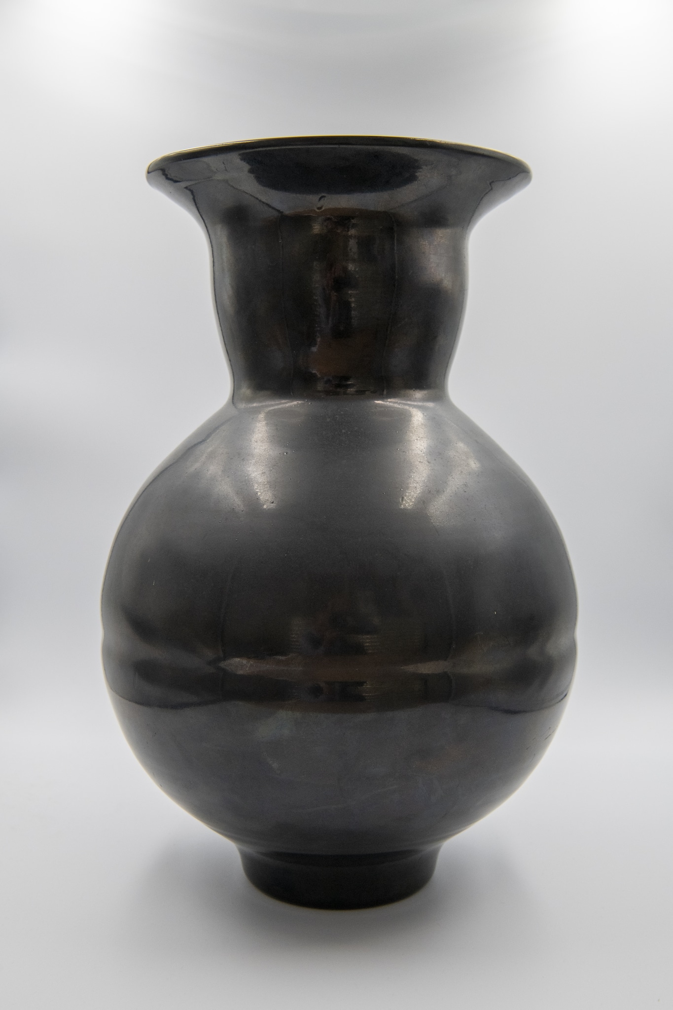 Ce modèle de vase (158) fut créé à une période précoce de la Verrerie artistique (1930-1964). Les sources dont nous disposons sont des catalogues de la Verrerie de St-Prex, certains inédits, tels que les albums noirs munis de photographies de vases, vraisemblablement utilisés par les représentants de 1931 à 1935, où ce modèle, disponible en verre vert et émaillé noir, porte le no 70 : H 38 cm (Verreries de St-Prex, 1931). Il fait également partie de l’offre du premier catalogue de vente imprimé en 1935 (Verreries de St-Prex, 1935 4), où il est reproduit en verre vert.