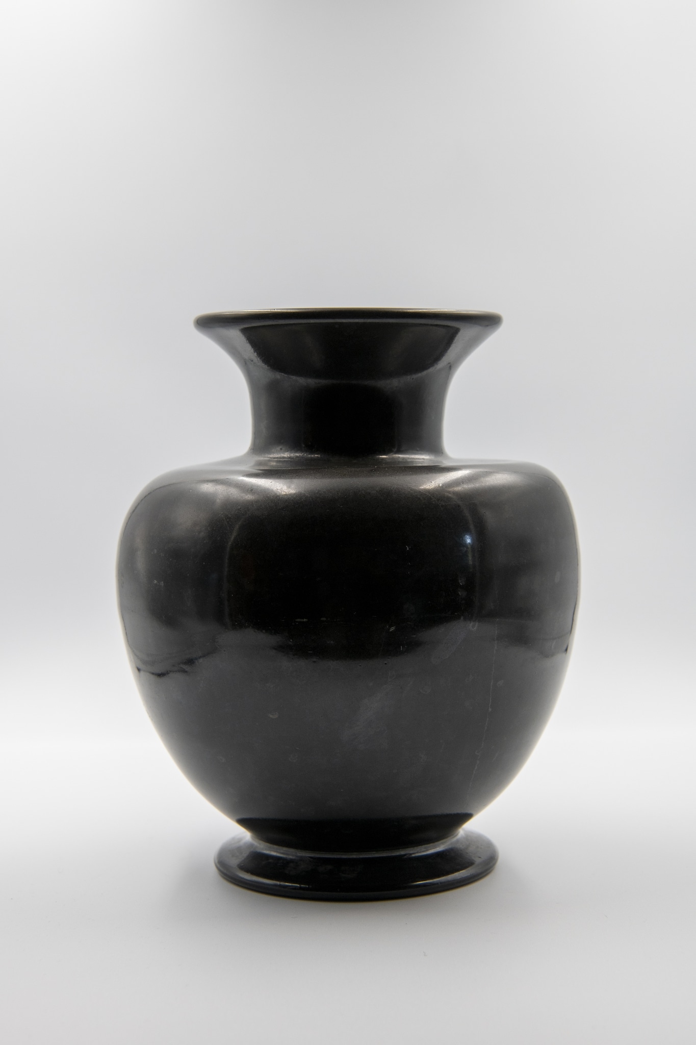 Ce modèle de vase fut créé à une période précoce de la Verrerie artistique (1930-1964). La source dont nous disposons est une série de catalogues inédits de la Verrerie de St-Prex: des catalogues de représentants en noir et blanc, utilisés entre 1931 et 1935. On le trouve comme modèle no 200, proposé en verre vert, émaillé rouge, bleu ou noir et en argenté craquelé (Verreries de St-Prex, 1931, 23 cm). Par la suite, le no 200 semble avoir été remplacé par le modèle 154, légèrement plus grand et à épaule moins marquée. Ce modèle d’avant 1935 n’apparaît pas dans la critique.