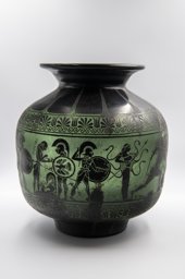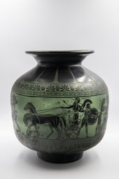 Le décor gravé à l'acide propose des scènes de la mort d'Achille. L’iconographie est fidèle au modèle d’un vase antique, publié en 1833, mais aujourd’hui perdu. Il s’agit du cinquième chant de l’Iliade d’Homère. Durant son stage au Vitrocentre Romont, Thibault Hugentobler a découvert la source iconographique (Belzik, 2018).