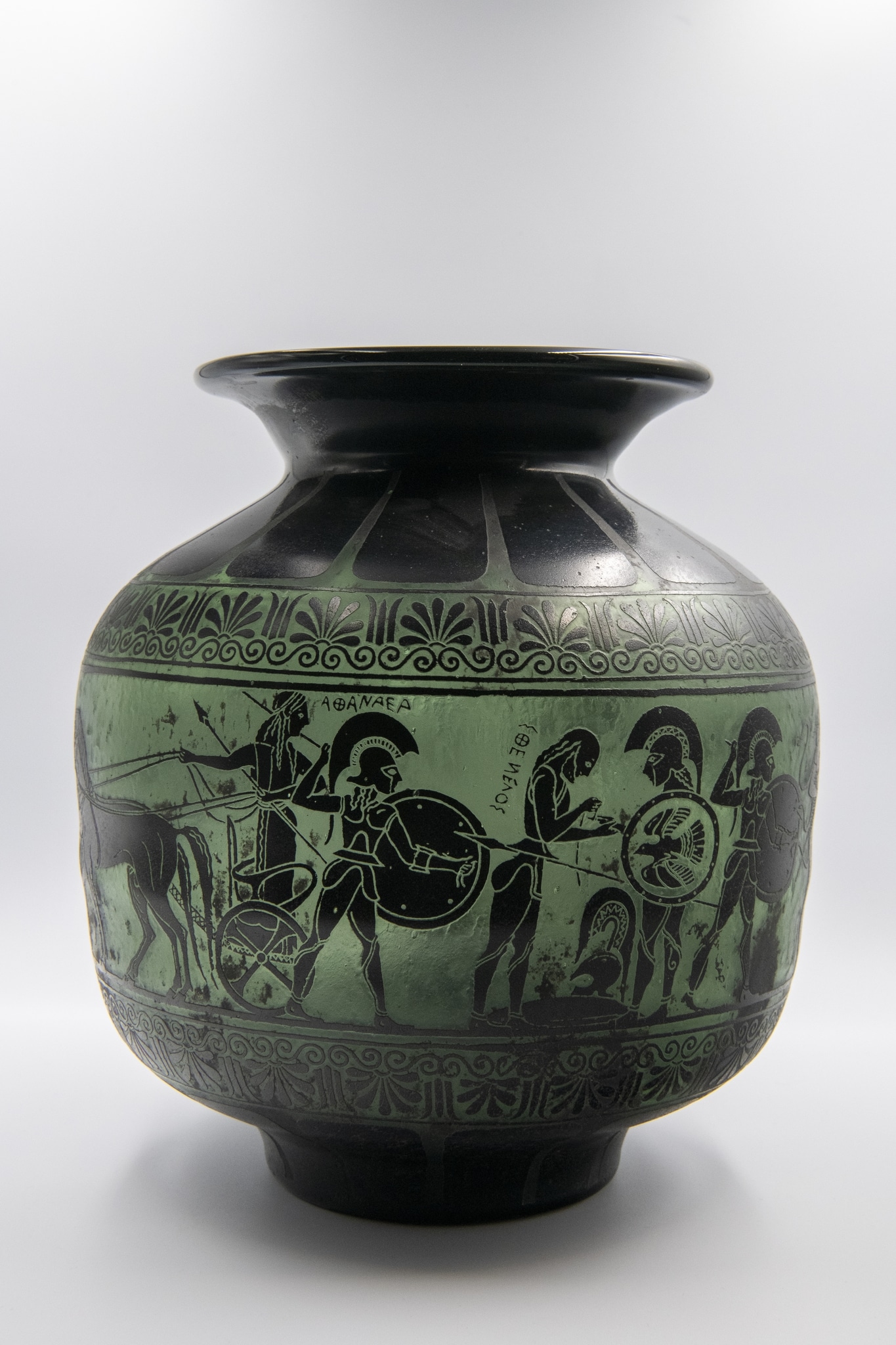 Sthenelos, Diomède, Achilles, Ajax, Glaukos, Paris, Énée, Léodokos, Échippos (Sur la panse: noms réservés à l'acide à côté de personnages concernés)
