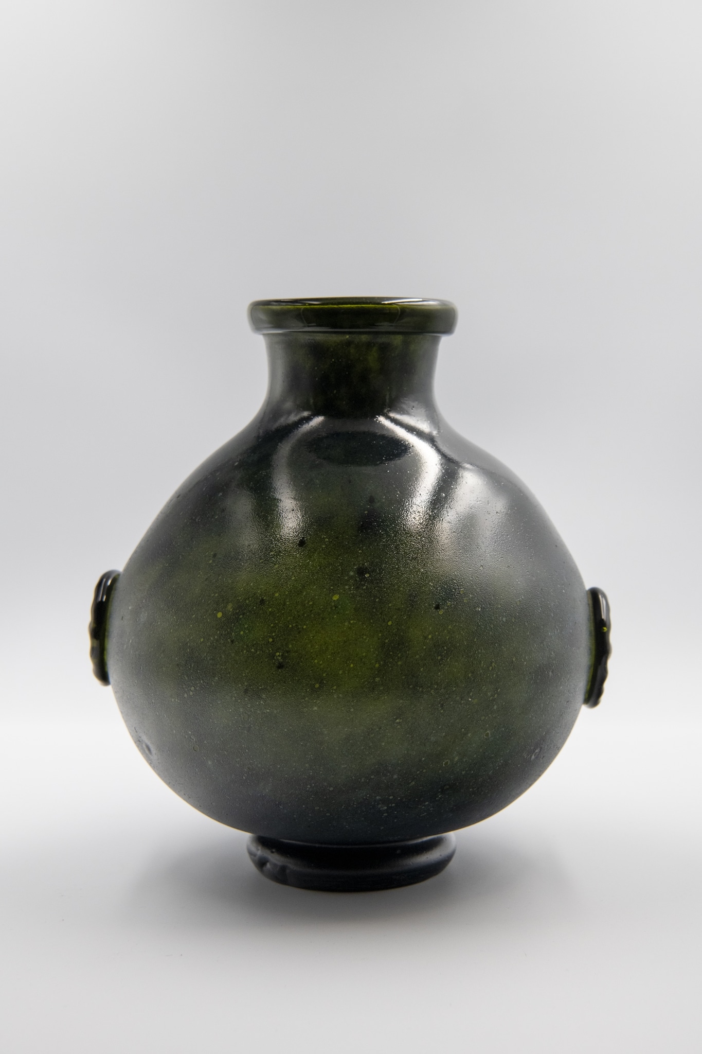 Ce modèle de vase fut créé à une période précoce de la Verrerie artistique (1930–1964). Les sources dont nous disposons sont des catalogues de la Verrerie de St-Prex, tels que les albums noirs munis de photos de vases, vraisemblablement utilisés par les représentants de 1931 à 1935. À petit talon, sans anses, serti de deux applications circulaires et coiffé par un col à lèvre retournée, il y est proposé comme suit : « émaux appliqués, haut : 24 cm » (Verreries de St-Prex, 1931, no 171). Il représente une variante du modèle no 9, proposé avec pied appliqué. Dans le premier catalogue imprimé (Verreries de St-Prex, 1935, 18), les applications circulaires se retrouvent sur le modèle « Émaux », ancien modèle no 8. Le modèle 171 n’est plus proposé. Il ne manque ainsi au vase présent que le petit talon à la place du piédouche pour correspondre exactement au modèle 171. Ce dernier permet également de retracer le processus d’élaboration de la collection de 1935 : à la boule viennent s’ajouter le pied et le col pour créer un objet harmonieux, mais facile à la production. Les appliques enrichissent le modèle exclusif, intitulé « Émaux ».