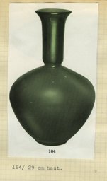 Ce modèle de vase (164) fut créé à une période précoce de la Verrerie artistique (1930-1964). Les sources dont nous disposons sont des catalogues de la Verrerie de St-Prex, certains inédits, tels que les albums noirs munis de photographies de vases, vraisemblablement utilisés par les représentants de 1931 à 1935, où ce modèle, disponible en verre vert, porte le no 5 : H 15 et 29 cm (Verreries de St-Prex, 1931). Il fait également partie de l’offre du premier catalogue de vente imprimé en 1935 (Verreries de St-Prex, 1935, 8, et 16), où il est décliné en verre vert ou émaillé noir.