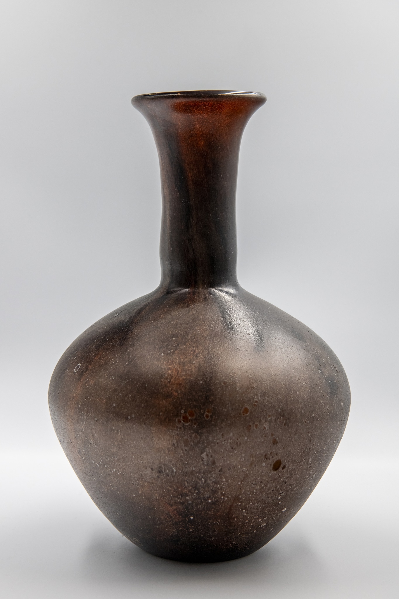 Verre incolore, coloration (blanc, rouge et noir: effet brun) à chaud sans fusion, soufflé en moule, col long, lèvre évasée; forme: panse ovoïde