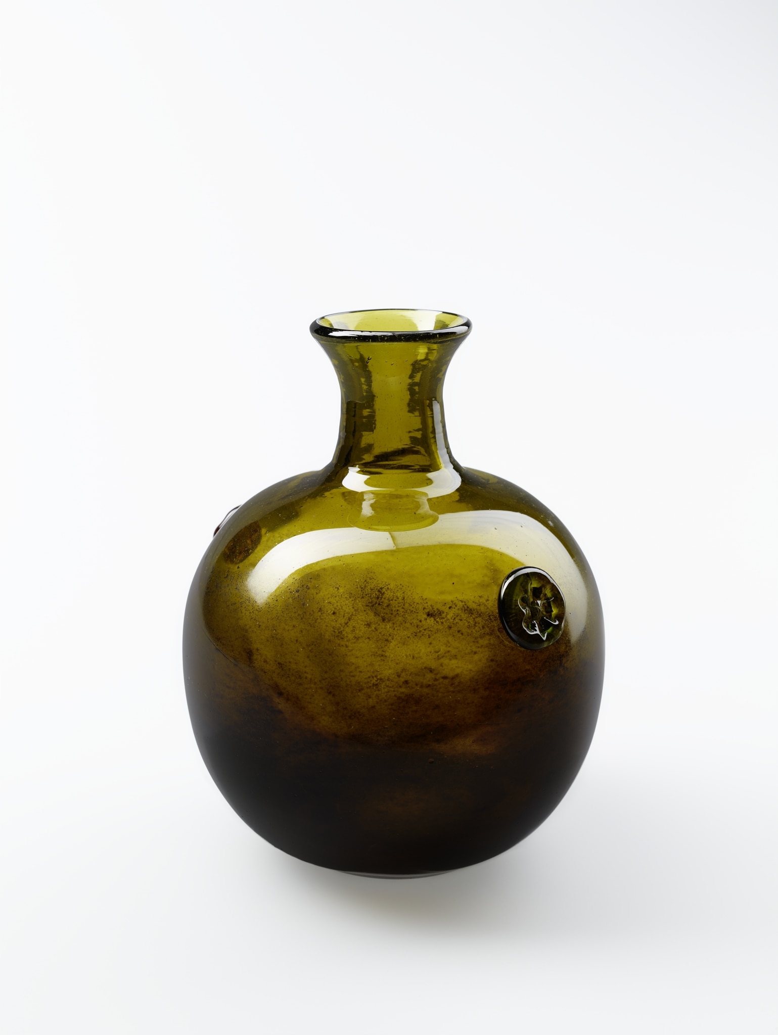 Verre vert, soufflé en moule, talon, revêtement noir posé à l'aérographe; forme: panse boule, col étroit, lèvre retournée. Les deux rosaces placées de manière symétrique sur la panse sont typiques des applications réalisées à l'aide d'une pince dont les embouts tells de petites formes permettent d'imprimer au verre liquide la forme du métal.