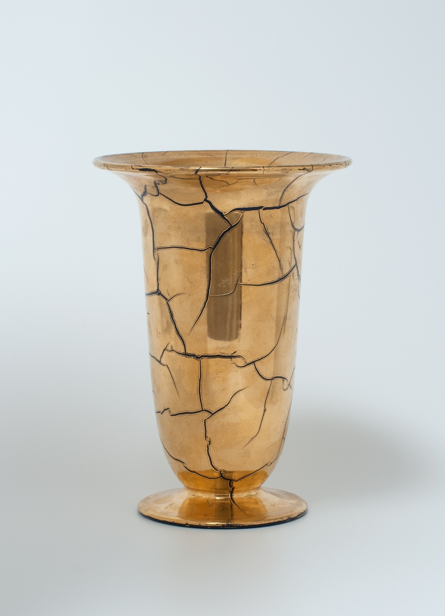 Le décor doré craquelé du vase présenté ici est emblématique de la Verrerie artistique, son apparition coïncidant avec la publication du catalogue de 1935. La qualité du craquelé – large et brillant – est caractéristique de l’après-guerre, alors que l’émail bleu utilisé précédemment n’était plus disponible (Walther, 2025, 65). Ce vase est donc daté entre 1942 environ, date de la fermeture de l'entreprise qui livrait l'émail, et 1960. En effet, la dernière liste de prix de 1960 ne le propose plus qu'avec une hauteur de 12 cm.