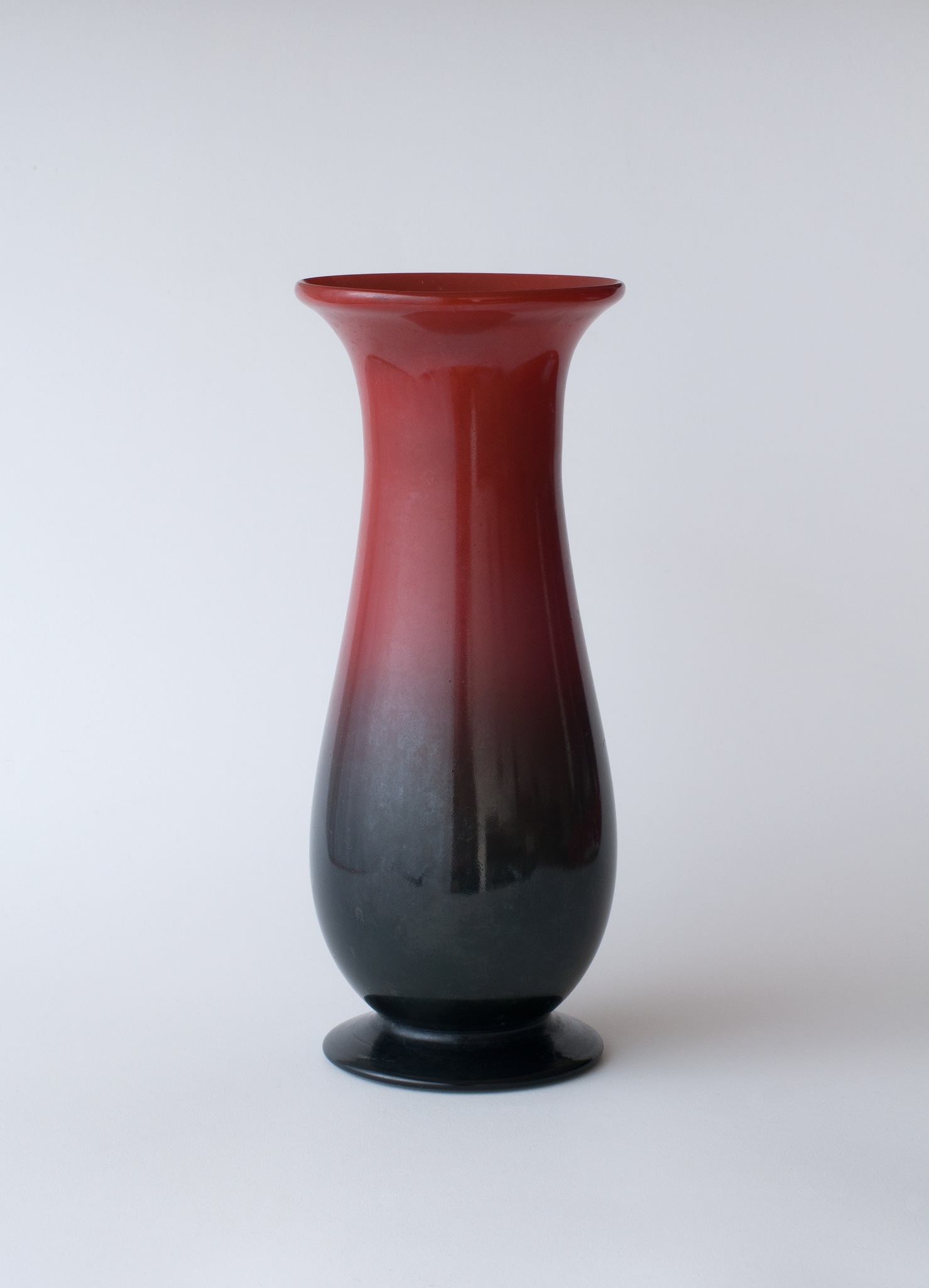 Verre incolore soufflé en moule, pied appliqué, revêtement émaillé noir et rouge posé à l'aérographe; forme: balustre