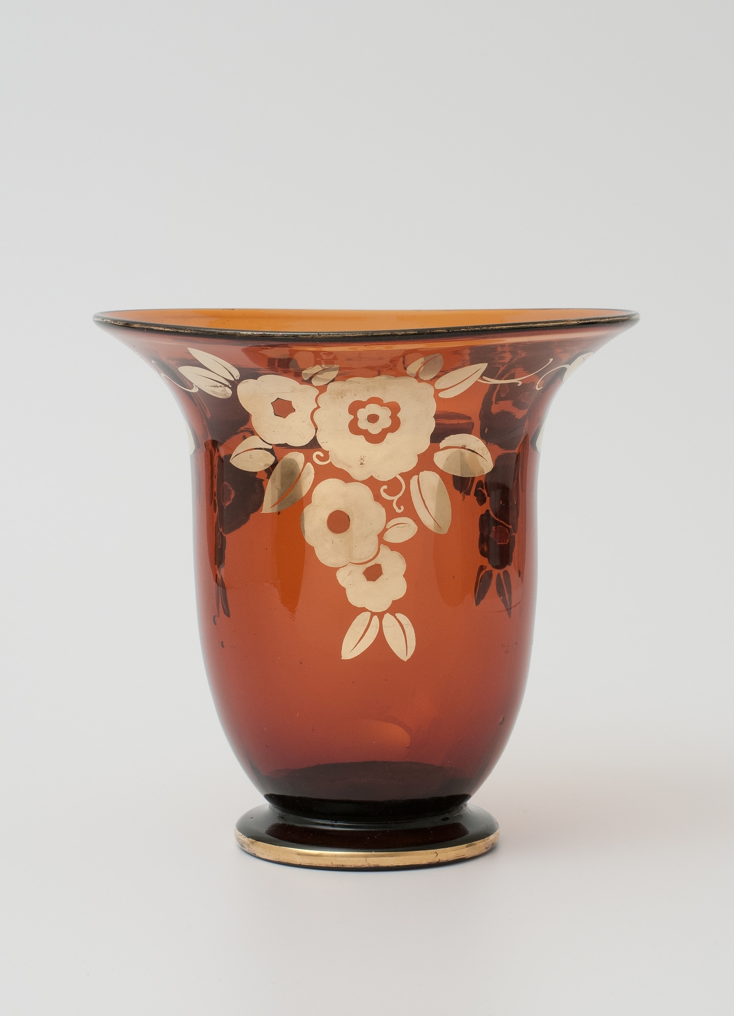 Verre brun, soufflé en moule, pied appliqué, lèvre évasée, revêtement: décor floral doré sur la panse avec une touche d'émail rose au centre des fleurs, lèvre bordée d'or; forme: panse balustre