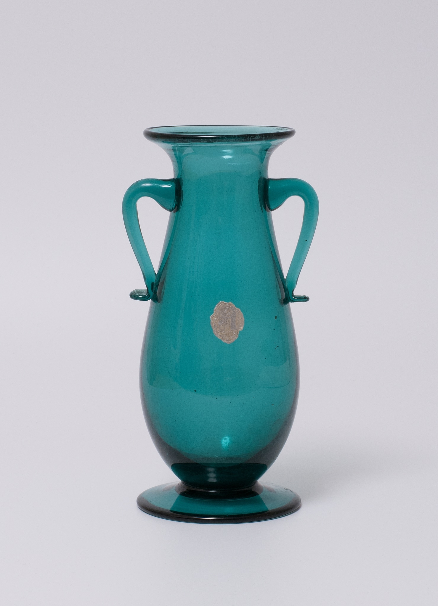 Ce modèle de vase (147) fut créé à une période précoce de la Verrerie artistique (1930-1964). Il s’agit du même modèle que le 146, avec l’adjonction d’anses. Les sources dont nous disposons sont des catalogues de la Verrerie de St-Prex, certains inédits, tels que les albums noirs munis de photographies de vases, vraisemblablement utilisés par les représentants de 1931 à 1935, où ce modèle est proposé comme no "spécial vert" : H 35, 50 cm, (Verreries de St-Prex, 1931). Il fait également partie de l’offre du premier catalogue de vente imprimé en 1935 (Verreries de St-Prex, 1935, no 147, 2 et 14) où ce vase est décliné en verre vert et en argent craquelé. Il figure ensuite dans un répertoire non publié, qui, basé sur les numéros d’inventaire des catalogues de 1935 à 1960, dresse la liste de tous les modèles de la production artistique (Verreries de St-Prex, 1964, H 22, 27, 32 et 43 cm). Dès 1951, le grand format (43 cm) n’est plus produit (Verreries de St-Prex, 1951). D’après les sources, ce modèle a été ainsi élaboré dès 1931 et produit jusqu’en 1964. Dans la critique récente, ce vase avec anses apparaît chez Dreyfus (Dreyfus, 1981, 12 et 26), qui reproduit le plan de moule pour la taille de 22 cm, daté du 19 août 1939. À cette époque, le vase était déjà en production depuis environ huit ans. Il doit ainsi s’agir d’un nouveau moule, réalisé pour remplacer le précédent, trop usé. Par ailleurs, en 1933 déjà, le céramiste Paul Ami Bonifas consacre un article à la "verrerie" où les vases réalisés en 1931 sous sa direction à Saint-Prex illustrent son propos (Bonifas, 1933).