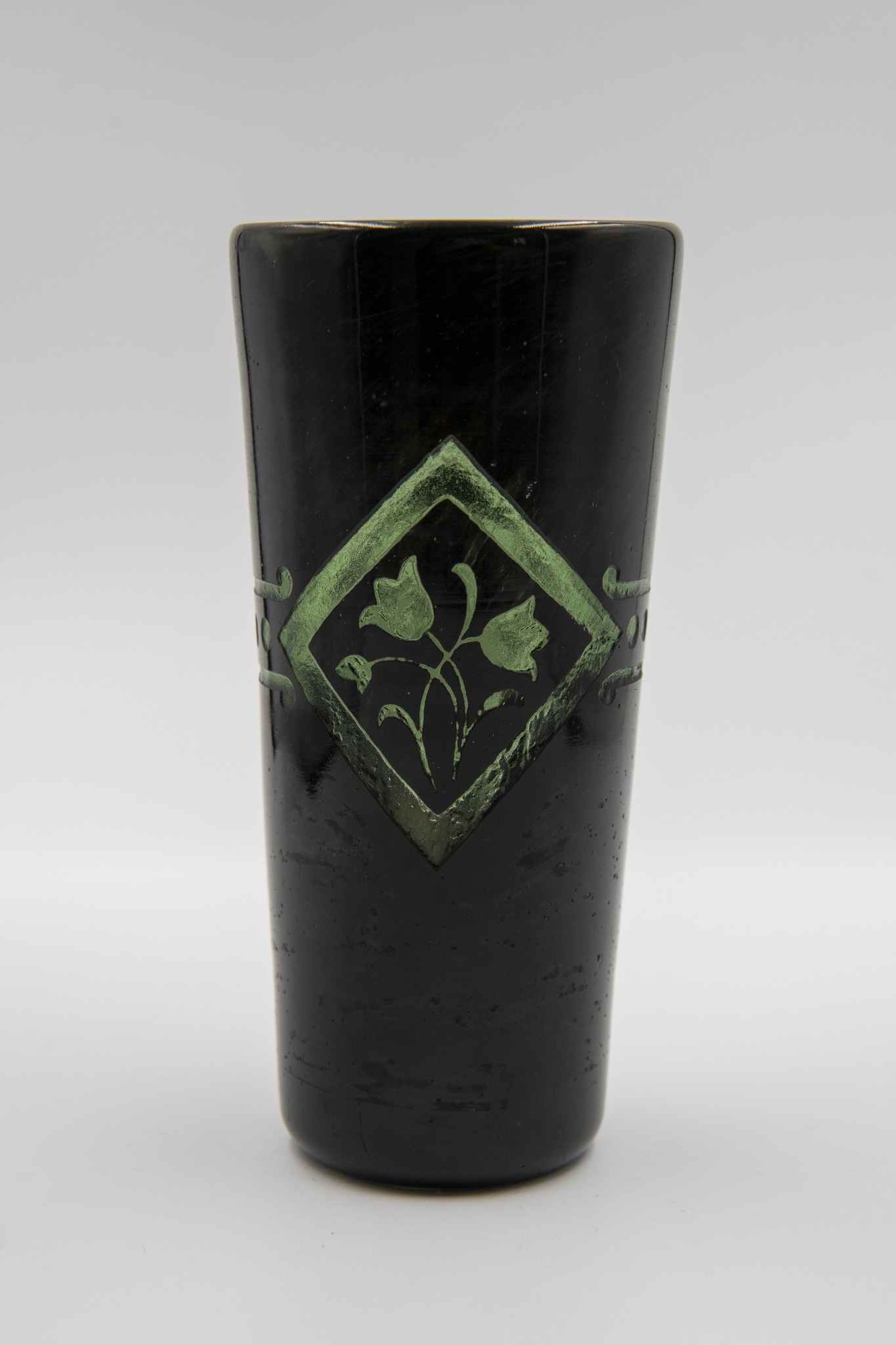 Verre vert soufflé en moule, doublé de verre noir, gravé à l'acide; forme tronconique