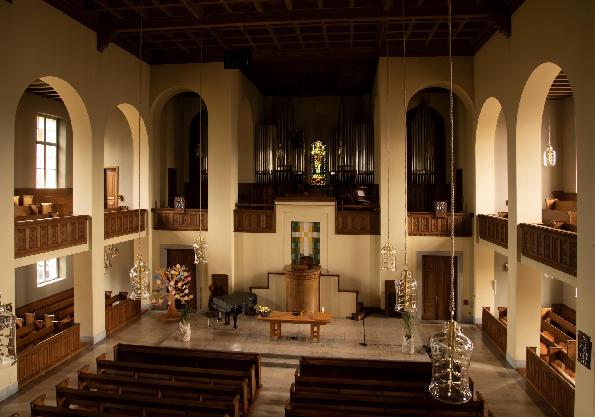 Erbaut 1920–24 durch Klauser & Streit im neoklassizistischen Stil; 1987 innen renoviert, 1995 aussen renoviert. Glasgemälde von Fred Stauffer und Albin Schweri.