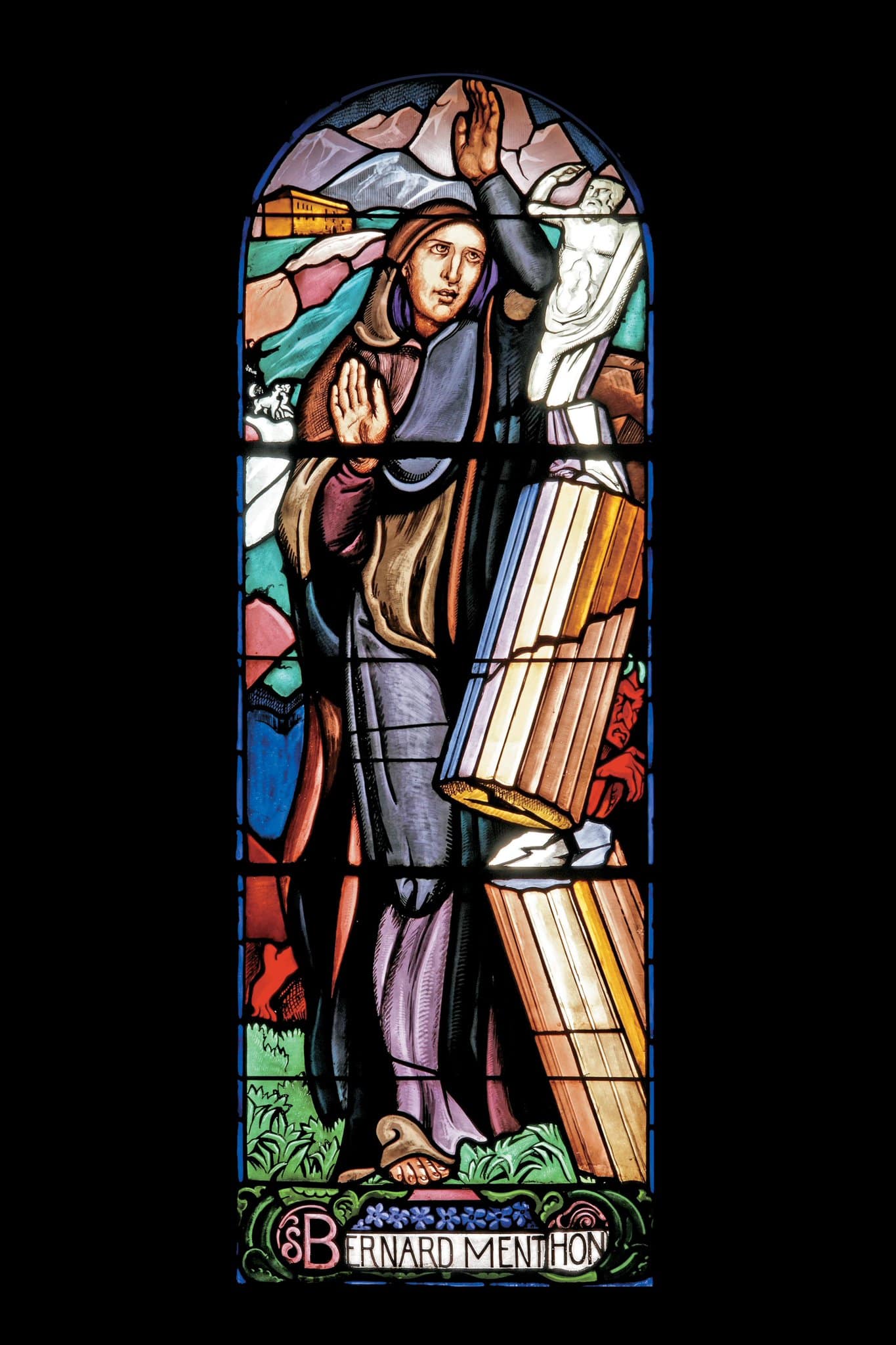 Bernard de Menthon est le fondateur de l’Hospice du Grand Saint-Bernard. Sur les hauteurs du Mont Joux, alors passage des Alpes, l’empereur Auguste y avait instauré le culte à Jupiter. Un jour, Bernard y monta avec des compagnons et détruisit la statue et la colonne où elle reposait puis en chassa l’esprit maléfique (“Les nouvelles œuvres de Maurice Denis […]”, 1923), scène figurée sur ce vitrail.