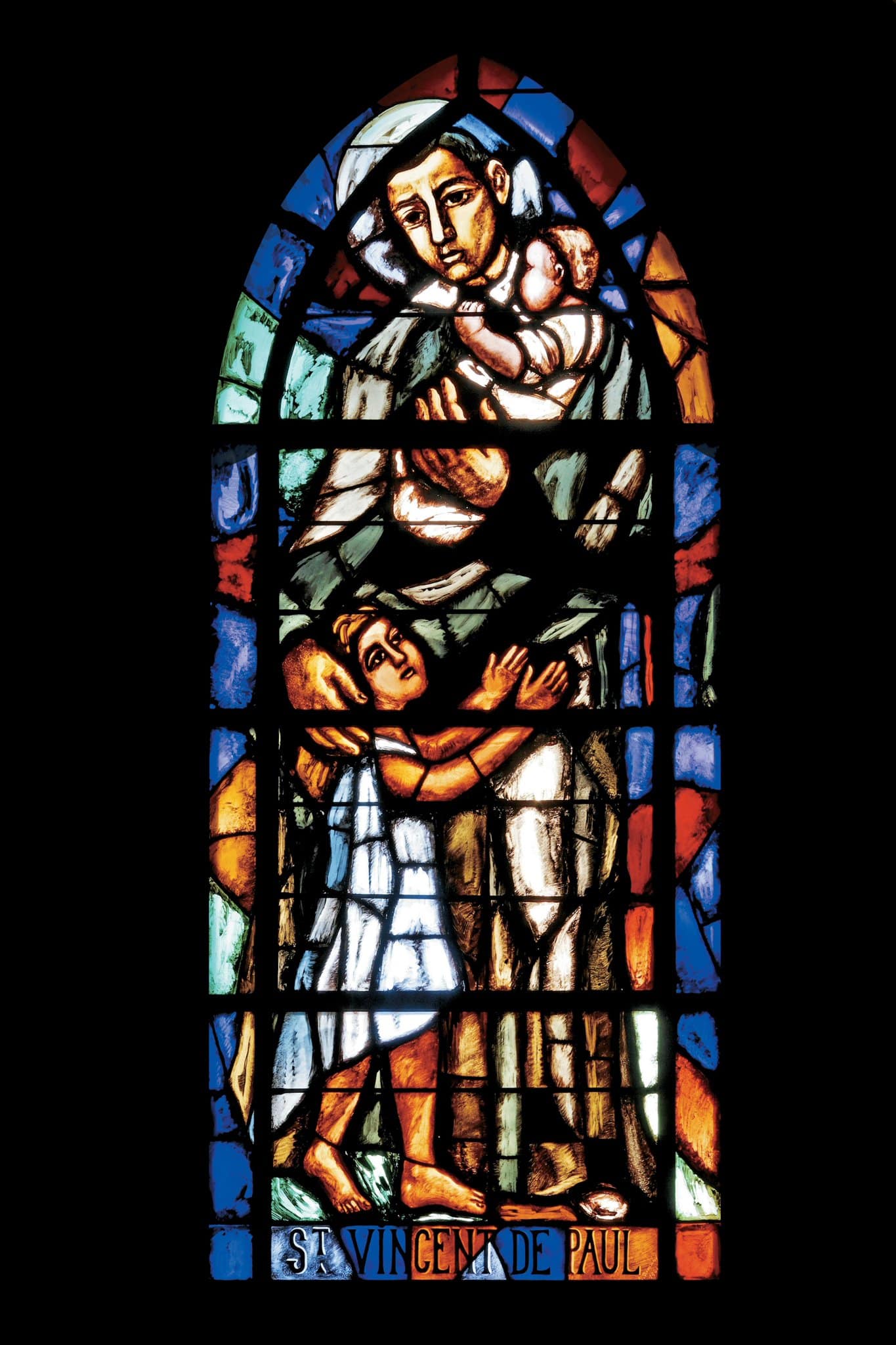 Saint Vincent de Paul tient un enfant dans ses bras, alors qu’un autre lui tend ses bras.