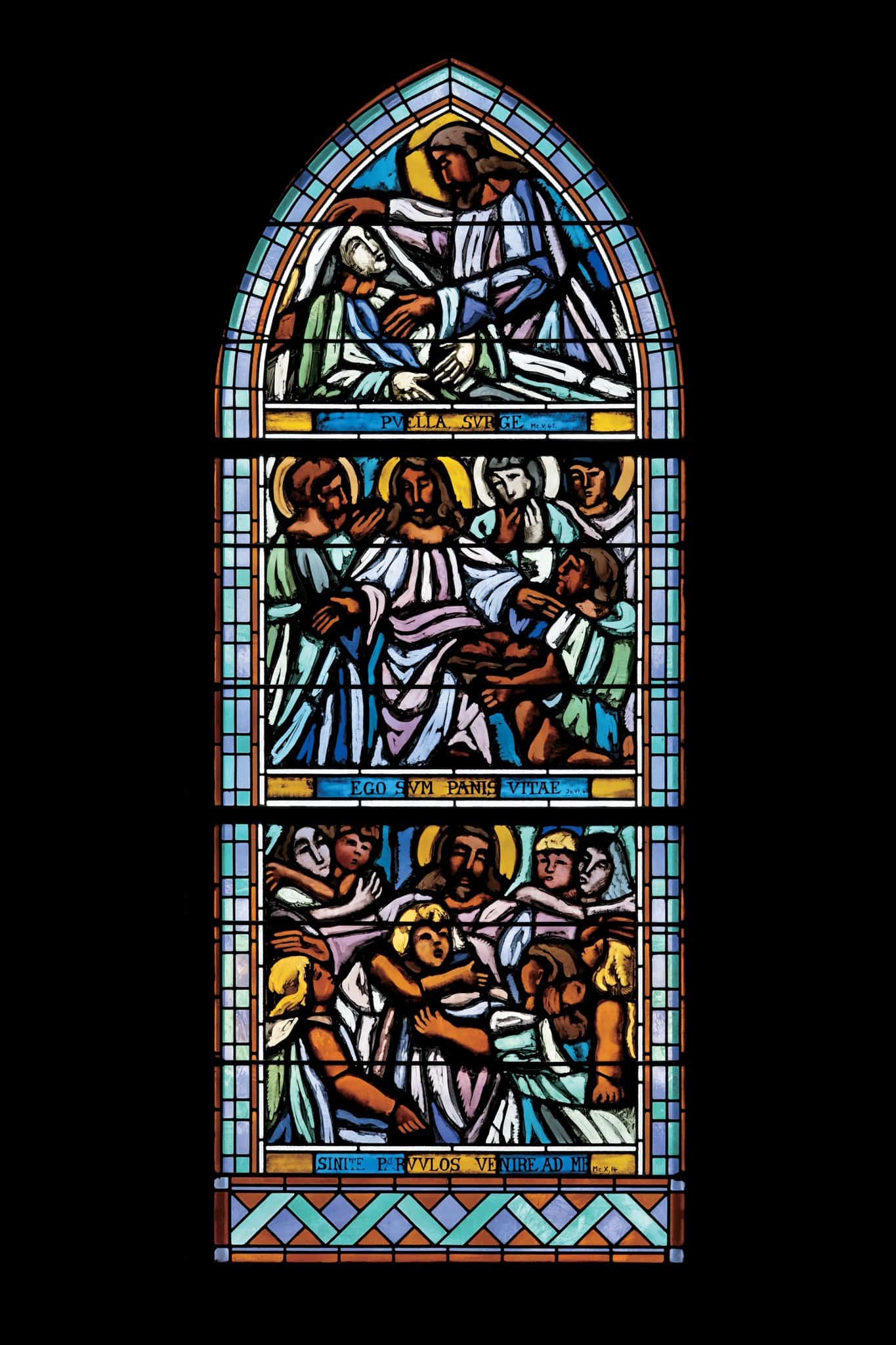 PVella sVrge Mc, V.41 / Ego sVm panis vitae Jo, VI.48 / Sinite parvVlos venire ad me, Mc, X.14 (bandeau sous chaque scène)
