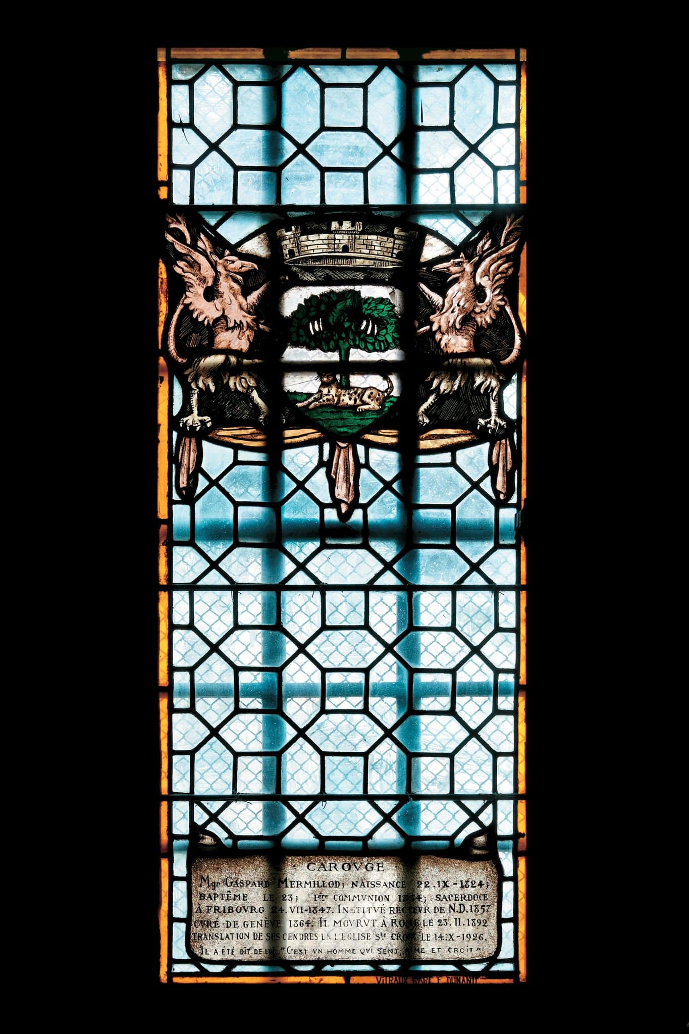 CAROUGE / MGR. GASPARD MERMILLOD; NAISSANCE 22.IX-1824; / BAPTÊME LE 23; Ière COMMVNION 1834; / SACERDOCE / A FRIBOVRG 24.VII-1847. INSTITVE RECTEUR DE N.D. 1857 / CVRE DE GENEVE 1864. IL MOURUT A ROME LE 23.II.1892 / TRANSLATION DE SES CENDRES EN L’EGLISE Ste CROIX LE 14.IX-1926. / IL A ETE DIT DE LUI “C’EST UN HOMME QUI SENT, AIME ET CROIT” (cartouche)