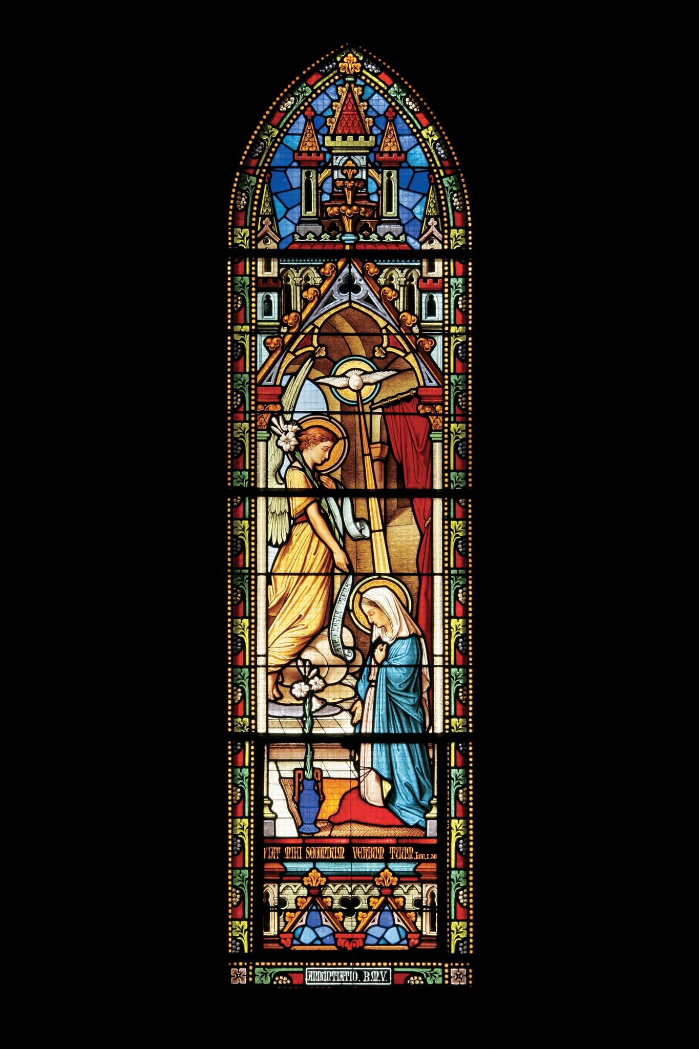 L’ange Gabriel tient un lys blanc et salue Marie agenouillée devant lui. La colombe du Saint-Esprit descend sur elle.