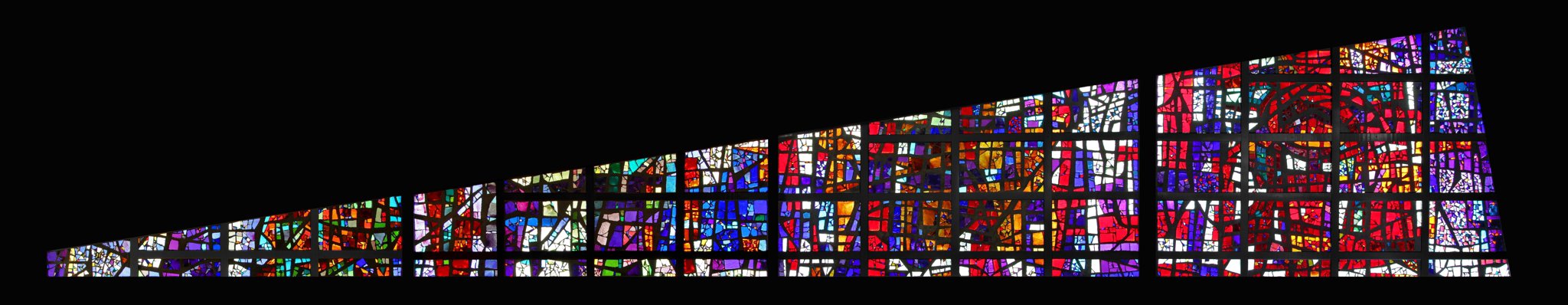 Vitrail-façade composé de quatre travées aux teintes diverses à dominance rouge, bleue et blanche.