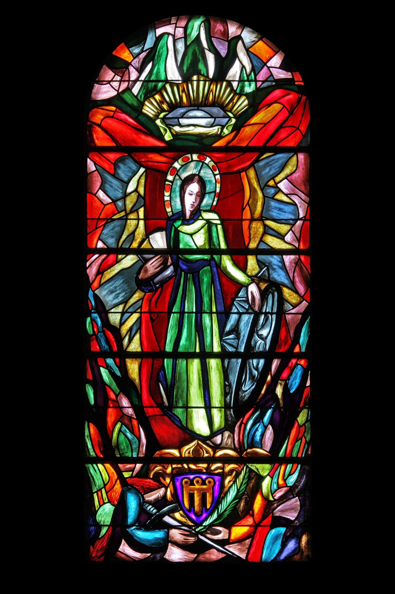Sainte Catherine s’appuie sur la roue de son supplice et tient les Ecritures. Au-dessus, une scène montre le corps de la sainte miraculeusement transporté sur le Mont Sinaï. En-dessous les armoiries de la famille de Resmes présentés par deux anges.